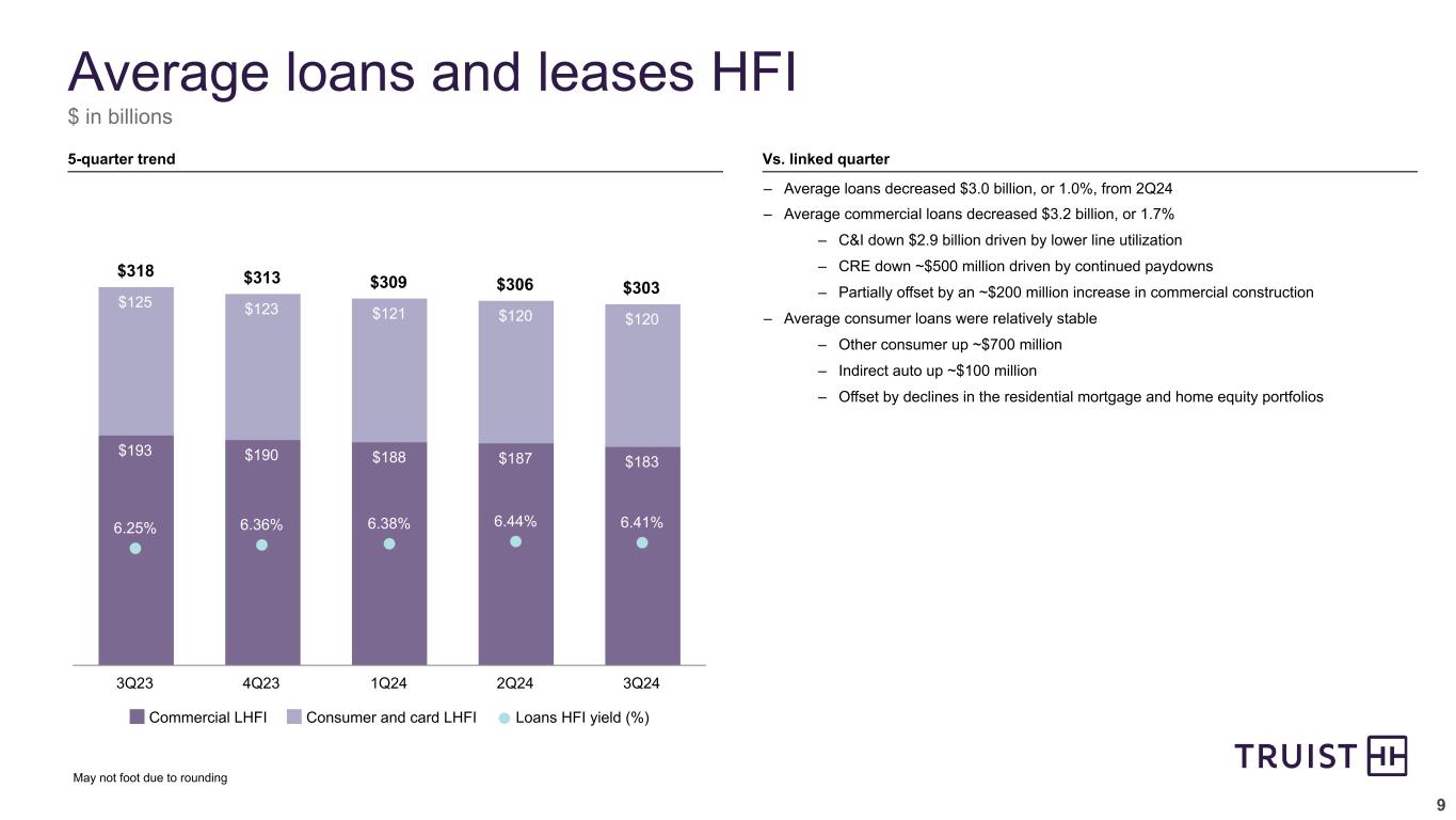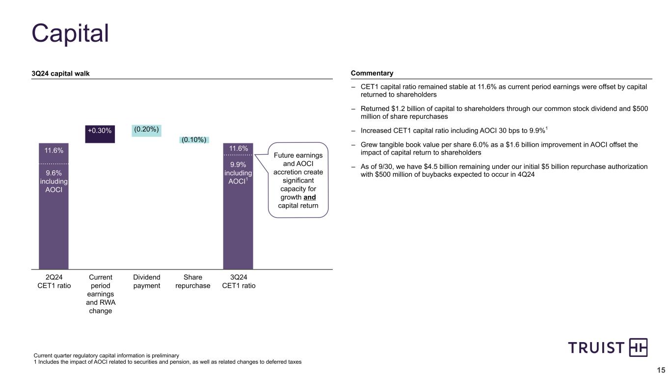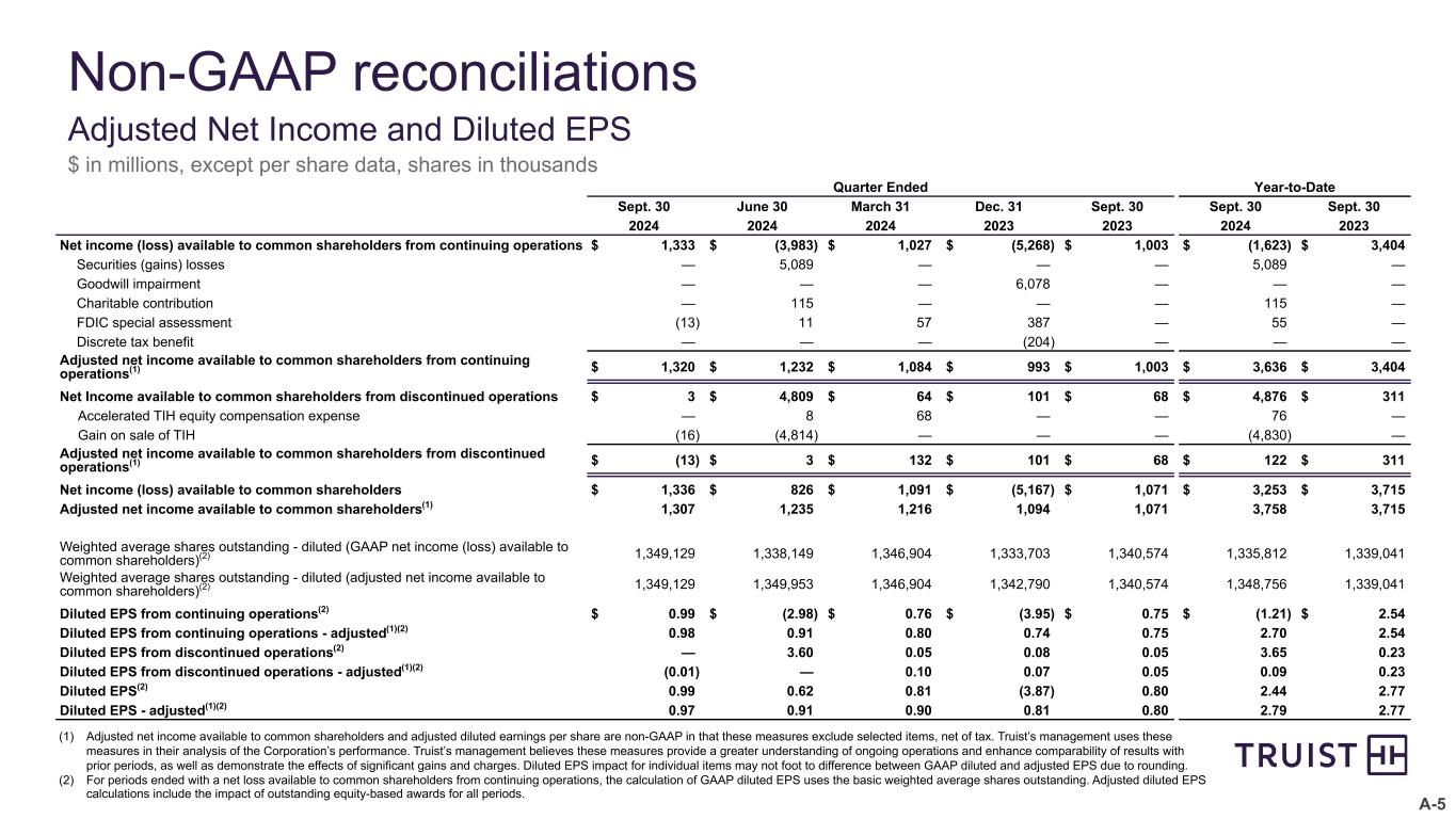 A-5 Quarter Ended Year-to-Date Sept. 30 June 30 March 31 Dec. 31 Sept. 30 Sept. 30 Sept. 30 2024 2024 2024 2023 2023 2024 2023 Net income (loss) available to common shareholders from continuing operations $ 1,333 $ (3,983) $ 1,027 $ (5,268) $ 1,003 $ (1,623) $ 3,404 Securities (gains) losses — 5,089 — — — 5,089 — Goodwill impairment — — — 6,078 — — — Charitable contribution — 115 — — — 115 — FDIC special assessment (13) 11 57 387 — 55 — Discrete tax benefit — — — (204) — — — Adjusted net income available to common shareholders from continuing operations(1) $ 1,320 $ 1,232 $ 1,084 $ 993 $ 1,003 $ 3,636 $ 3,404 Net Income available to common shareholders from discontinued operations $ 3 $ 4,809 $ 64 $ 101 $ 68 $ 4,876 $ 311 Accelerated TIH equity compensation expense — 8 68 — — 76 — Gain on sale of TIH (16) (4,814) — — — (4,830) — Adjusted net income available to common shareholders from discontinued operations(1) $ (13) $ 3 $ 132 $ 101 $ 68 $ 122 $ 311 Net income (loss) available to common shareholders $ 1,336 $ 826 $ 1,091 $ (5,167) $ 1,071 $ 3,253 $ 3,715 Adjusted net income available to common shareholders(1) 1,307 1,235 1,216 1,094 1,071 3,758 3,715 Weighted average shares outstanding - diluted (GAAP net income (loss) available to common shareholders)(2) 1,349,129 1,338,149 1,346,904 1,333,703 1,340,574 1,335,812 1,339,041 Weighted average shares outstanding - diluted (adjusted net income available to common shareholders)(2) 1,349,129 1,349,953 1,346,904 1,342,790 1,340,574 1,348,756 1,339,041 Diluted EPS from continuing operations(2) $ 0.99 $ (2.98) $ 0.76 $ (3.95) $ 0.75 $ (1.21) $ 2.54 Diluted EPS from continuing operations - adjusted(1)(2) 0.98 0.91 0.80 0.74 0.75 2.70 2.54 Diluted EPS from discontinued operations(2) — 3.60 0.05 0.08 0.05 3.65 0.23 Diluted EPS from discontinued operations - adjusted(1)(2) (0.01) — 0.10 0.07 0.05 0.09 0.23 Diluted EPS(2) 0.99 0.62 0.81 (3.87) 0.80 2.44 2.77 Diluted EPS - adjusted(1)(2) 0.97 0.91 0.90 0.81 0.80 2.79 2.77 Non-GAAP reconciliations Adjusted Net Income and Diluted EPS $ in millions, except per share data, shares in thousands (1) Adjusted net income available to common shareholders and adjusted diluted earnings per share are non-GAAP in that these measures exclude selected items, net of tax. Truist’s management uses these measures in their analysis of the Corporation’s performance. Truist’s management believes these measures provide a greater understanding of ongoing operations and enhance comparability of results with prior periods, as well as demonstrate the effects of significant gains and charges. Diluted EPS impact for individual items may not foot to difference between GAAP diluted and adjusted EPS due to rounding. (2) For periods ended with a net loss available to common shareholders from continuing operations, the calculation of GAAP diluted EPS uses the basic weighted average shares outstanding. Adjusted diluted EPS calculations include the impact of outstanding equity-based awards for all periods.