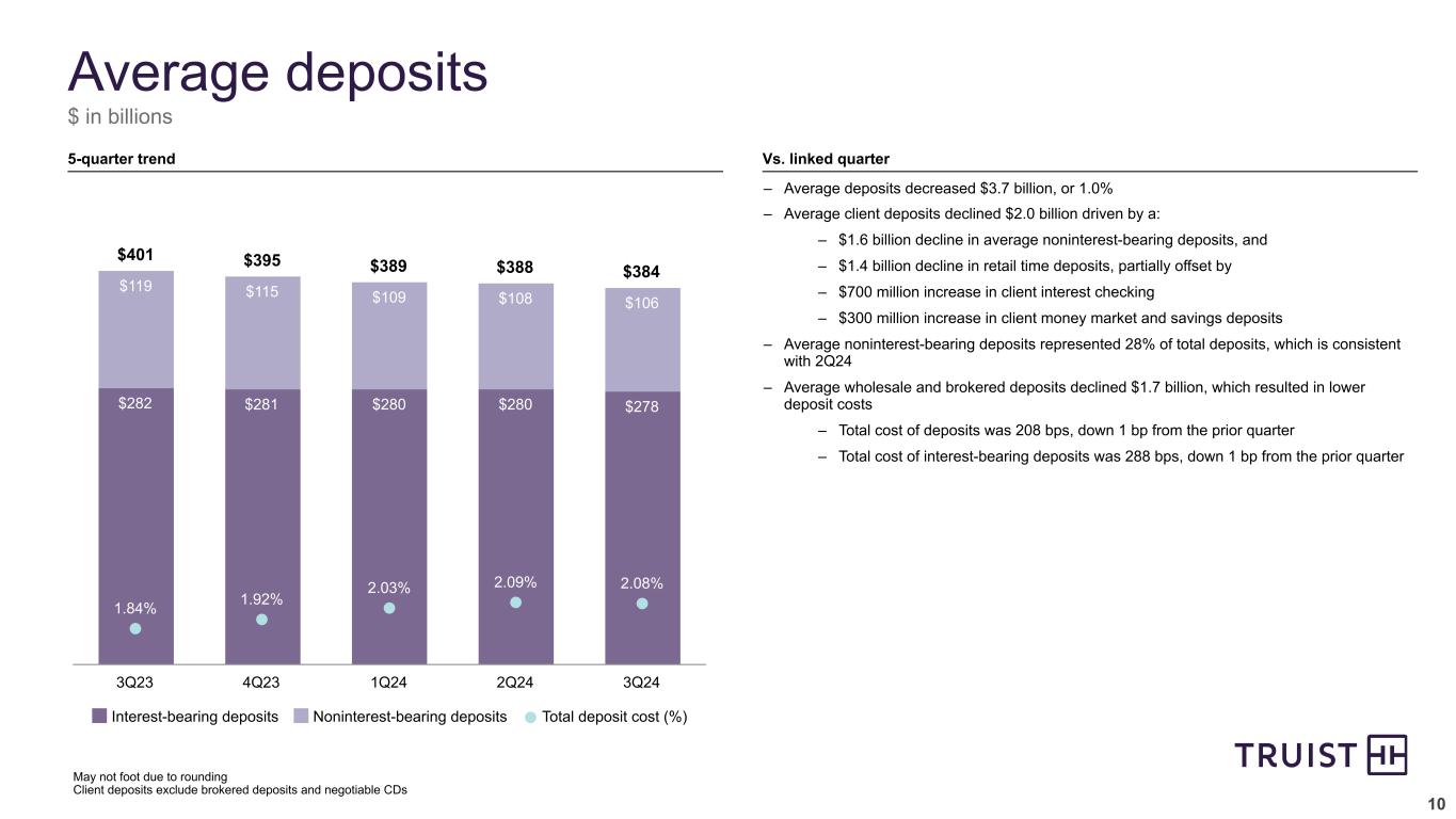 9 $318 $313 $309 $306 $303 $193 $190 $188 $187 $183 $125 $123 $121 $120 $120 6.25% 6.36% 6.38% 6.44% 6.41% Commercial LHFI Consumer and card LHFI Loans HFI yield (%) 3Q23 4Q23 1Q24 2Q24 3Q24 Average loans and leases HFI $ in billions – Average loans decreased $3.0 billion, or 1.0%, from 2Q24 – Average commercial loans decreased $3.2 billion, or 1.7% – C&I down $2.9 billion driven by lower line utilization – CRE down ~$500 million driven by continued paydowns – Partially offset by an ~$200 million increase in commercial construction – Average consumer loans were relatively stable – Other consumer up ~$700 million – Indirect auto up ~$100 million – Offset by declines in the residential mortgage and home equity portfolios 5-quarter trend Vs. linked quarter May not foot due to rounding