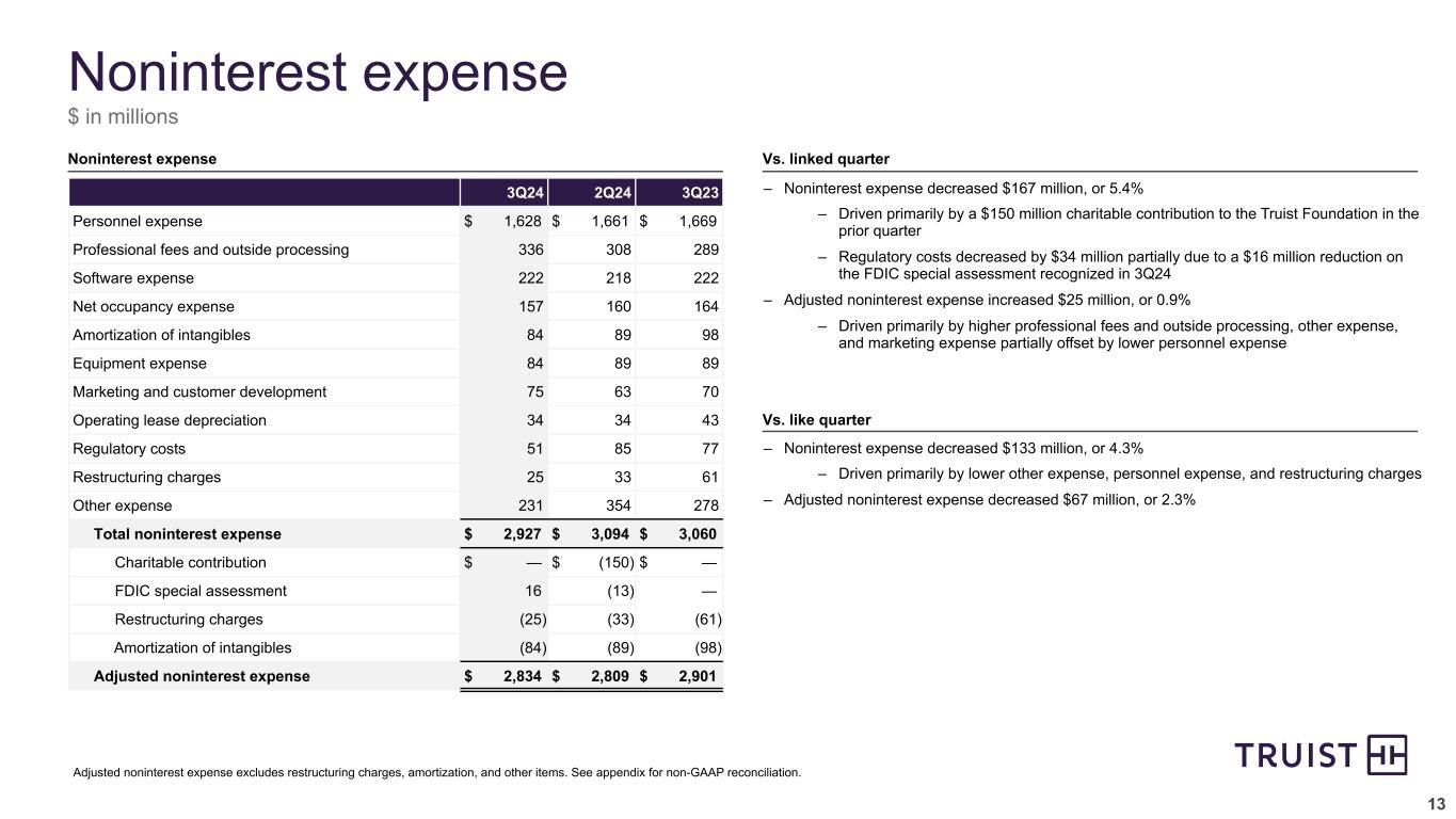 12 – Noninterest income increased 11% primarily due to higher investment banking and trading income and service charges on deposits – Noninterest income increased $6.7 billion as the prior quarter was negatively impacted by $6.7 billion of investment securities losses related to the balance sheet repositioning – Adjusted noninterest income increased 3.1% primarily due to higher other income and investment banking and trading income, partially offset by lower mortgage banking and wealth management income – Decline in wealth management income reflects the sale of Sterling Capital Management, partially offset by higher AUM – Other income increased primarily due to higher equity investment income and also included a gain on the sale of Sterling Capital Management that was offset by the valuation decrease for derivatives related to VISA B shares Noninterest income Vs. linked quarter Vs. like quarter Noninterest income 3Q24 2Q24 3Q23 Wealth management income $ 350 $ 361 $ 343 Investment banking and trading income 332 286 185 Card and payment related fees 222 230 238 Service charges on deposits 221 232 154 Mortgage banking income 106 112 102 Lending related fees 88 89 102 Operating lease income 49 50 63 Securities gains (losses) — (6,650) — Other income 115 78 147 Total noninterest income $ 1,483 $ (5,212) $ 1,334 Securities gains (losses) $ — $ 6,650 $ — Adjusted noninterest income $ 1,483 $ 1,438 $ 1,334 $ in millions