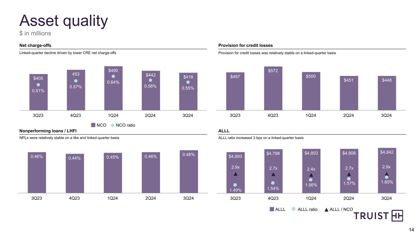 13 – Noninterest expense decreased $167 million, or 5.4% – Driven primarily by a $150 million charitable contribution to the Truist Foundation in the prior quarter – Regulatory costs decreased by $34 million partially due to a $16 million reduction on the FDIC special assessment recognized in 3Q24 – Adjusted noninterest expense increased $25 million, or 0.9% – Driven primarily by higher professional fees and outside processing, other expense, and marketing expense partially offset by lower personnel expense – Noninterest expense decreased $133 million, or 4.3% – Driven primarily by lower other expense, personnel expense, and restructuring charges – Adjusted noninterest expense decreased $67 million, or 2.3% Noninterest expense Vs. linked quarter Vs. like quarter $54 Adjusted noninterest expense excludes restructuring charges, amortization, and other items. See appendix for non-GAAP reconciliation. 3Q24 2Q24 3Q23 Personnel expense $ 1,628 $ 1,661 $ 1,669 Professional fees and outside processing 336 308 289 Software expense 222 218 222 Net occupancy expense 157 160 164 Amortization of intangibles 84 89 98 Equipment expense 84 89 89 Marketing and customer development 75 63 70 Operating lease depreciation 34 34 43 Regulatory costs 51 85 77 Restructuring charges 25 33 61 Other expense 231 354 278 Total noninterest expense $ 2,927 $ 3,094 $ 3,060 Charitable contribution $ — $ (150) $ — FDIC special assessment 16 (13) — Restructuring charges (25) (33) (61) Amortization of intangibles (84) (89) (98) Adjusted noninterest expense $ 2,834 $ 2,809 $ 2,901 Noninterest expense $ in millions