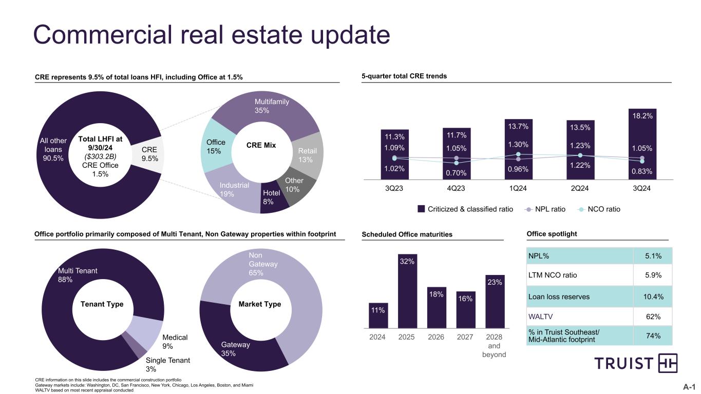 A-19 Multi Tenant 88% Medical 9% Single Tenant 3% Hotel 8% Industrial 19% Office 15% Multifamily 35% Retail 13% Other 10% 11.3% 11.7% 13.7% 13.5% 1.09% 1.05% 0.96% 1.22% 1.05% 1.02% 0.70% 1.30% 1.23% 0.83% Criticized & classified ratio NPL ratio NCO ratio 3Q23 4Q23 1Q24 2Q24 3Q24 CRE 9.5% 11% 32% 18% 16% 23% 2024 2025 2026 2027 2028 and beyond Commercial real estate update 5-quarter total CRE trends Total LHFI at 9/30/24 ($303.2B) CRE Office 1.5% CRE Mix Scheduled Office maturities CRE represents 9.5% of total loans HFI, including Office at 1.5% NPL% 5.1% LTM NCO ratio 5.9% Loan loss reserves 10.4% WALTV 62% % in Truist Southeast/ Mid-Atlantic footprint 74% Office spotlight All other loans 90.5% CRE information on this slide includes the commercial construction portfolio Gateway markets include: Washington, DC, San Francisco, New York, Chicago, Los Angeles, Boston, and Miami WALTV based on most recent appraisal conducted A-1 Office portfolio primarily composed of Multi Tenant, Non Gateway properties within footprint Gateway 35% Non Gateway 65% Tenant Type Market Type 18.2%