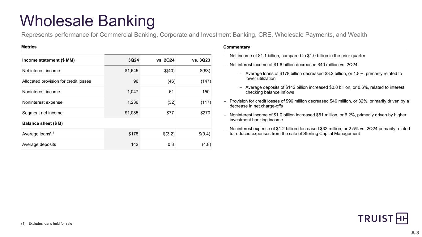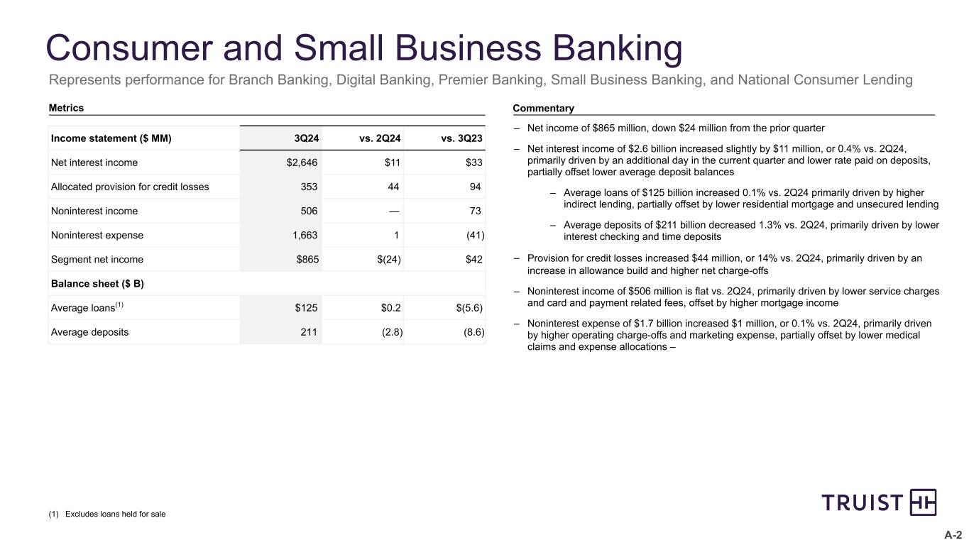A-2 Consumer and Small Business Banking Income statement ($ MM) 3Q24 vs. 2Q24 vs. 3Q23 Net interest income $2,646 $11 $33 Allocated provision for credit losses 353 44 94 Noninterest income 506 — 73 Noninterest expense 1,663 1 (41) Segment net income $865 $(24) $42 Balance sheet ($ B) Average loans(1) $125 $0.2 $(5.6) Average deposits 211 (2.8) (8.6) (1) Excludes loans held for sale Represents performance for Branch Banking, Digital Banking, Premier Banking, Small Business Banking, and National Consumer Lending – Net income of $865 million, down $24 million from the prior quarter – Net interest income of $2.6 billion increased slightly by $11 million, or 0.4% vs. 2Q24, primarily driven by an additional day in the current quarter and lower rate paid on deposits, partially offset lower average deposit balances – Average loans of $125 billion increased 0.1% vs. 2Q24 primarily driven by higher indirect lending, partially offset by lower residential mortgage and unsecured lending – Average deposits of $211 billion decreased 1.3% vs. 2Q24, primarily driven by lower interest checking and time deposits – Provision for credit losses increased $44 million, or 14% vs. 2Q24, primarily driven by an increase in allowance build and higher net charge-offs – Noninterest income of $506 million is flat vs. 2Q24, primarily driven by lower service charges and card and payment related fees, offset by higher mortgage income – Noninterest expense of $1.7 billion increased $1 million, or 0.1% vs. 2Q24, primarily driven by higher operating charge-offs and marketing expense, partially offset by lower medical claims and expense allocations – Metrics Commentary