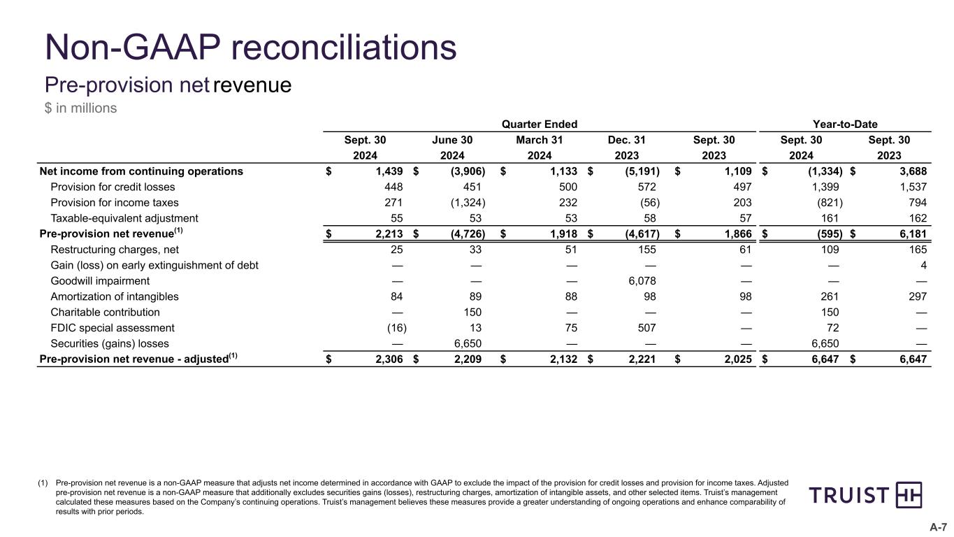 A-6 Non-GAAP reconciliations Efficiency ratio and fee income ratio from continuing operations $ in millions (1) Revenue is defined as net interest income plus noninterest income. (2) The adjusted efficiency ratio is non-GAAP in that it excludes securities gains and losses, amortization of intangible assets, restructuring charges, and other selected items. Adjusted revenue and adjusted noninterest expense are related measures used to calculate the adjusted efficiency ratio. Additionally, the adjusted fee income ratio is non-GAAP in that it excludes securities gains and losses and other selected items, and is calculated using adjusted revenue and adjusted noninterest income. Adjusted revenue and adjusted noninterest income exclude securities gains and losses and other selected items. Adjusted noninterest expense excludes amortization of intangible assets, restructuring charges, and other selected items. Truist’s management calculated these measures based on the Company’s continuing operations. Truist’s management uses these measures in their analysis of the Corporation’s performance. Truist’s management believes these measures provide a greater understanding of ongoing operations and enhance comparability of results with prior periods, as well as demonstrate the effects of significant gains and charges. Quarter Ended Year-to-Date Sept. 30 June 30 March 31 Dec. 31 Sept. 30 Sept. 30 Sept. 30 2024 2024 2024 2023 2023 2024 2023 Efficiency ratio numerator - noninterest expense - unadjusted $ 2,927 $ 3,094 $ 2,953 $ 9,557 $ 3,060 $ 8,974 $ 9,121 Restructuring charges, net (25) (33) (51) (155) (61) (109) (165) Gain (loss) on early extinguishment of debt — — — — — — (4) Goodwill impairment — — — (6,078) — — — Amortization of intangibles (84) (89) (88) (98) (98) (261) (297) Charitable contribution — (150) — — — (150) — FDIC special assessment 16 (13) (75) (507) — (72) — Efficiency ratio numerator - adjusted noninterest expense(2) $ 2,834 $ 2,809 $ 2,739 $ 2,719 $ 2,901 $ 8,382 $ 8,655 Fee income numerator - noninterest income - unadjusted $ 1,483 $ (5,212) $ 1,446 $ 1,363 $ 1,334 $ (2,283) $ 4,135 Securities (gains) losses, net — 6,650 — — — 6,650 — Fee income numerator - adjusted noninterest income(2) $ 1,483 $ 1,438 $ 1,446 $ 1,363 $ 1,334 $ 4,367 $ 4,135 Efficiency ratio and fee income ratio denominator - revenue(1) - unadjusted $ 5,085 $ (1,685) $ 4,818 $ 4,882 $ 4,869 $ 8,218 $ 15,140 Taxable equivalent adjustment 55 53 53 58 57 161 162 Securities (gains) losses — 6,650 — — — 6,650 — Efficiency ratio and fee income ratio denominator - adjusted revenue(1)((2) $ 5,140 $ 5,018 $ 4,871 $ 4,940 $ 4,926 $ 15,029 $ 15,302 Efficiency ratio - unadjusted 57.5 % NM 61.3 % NM 62.9 % NM 60.3 % Efficiency ratio - adjusted(2) 55.2 56.0 56.2 55.0 58.9 55.8 56.6 Fee income ratio - unadjusted 29.2 % NM 30.0 % 27.9 % 27.4 % NM 27.3 % Fee income ratio - adjusted(2) 28.9 28.7 29.7 27.6 27.1 29.1 27.0