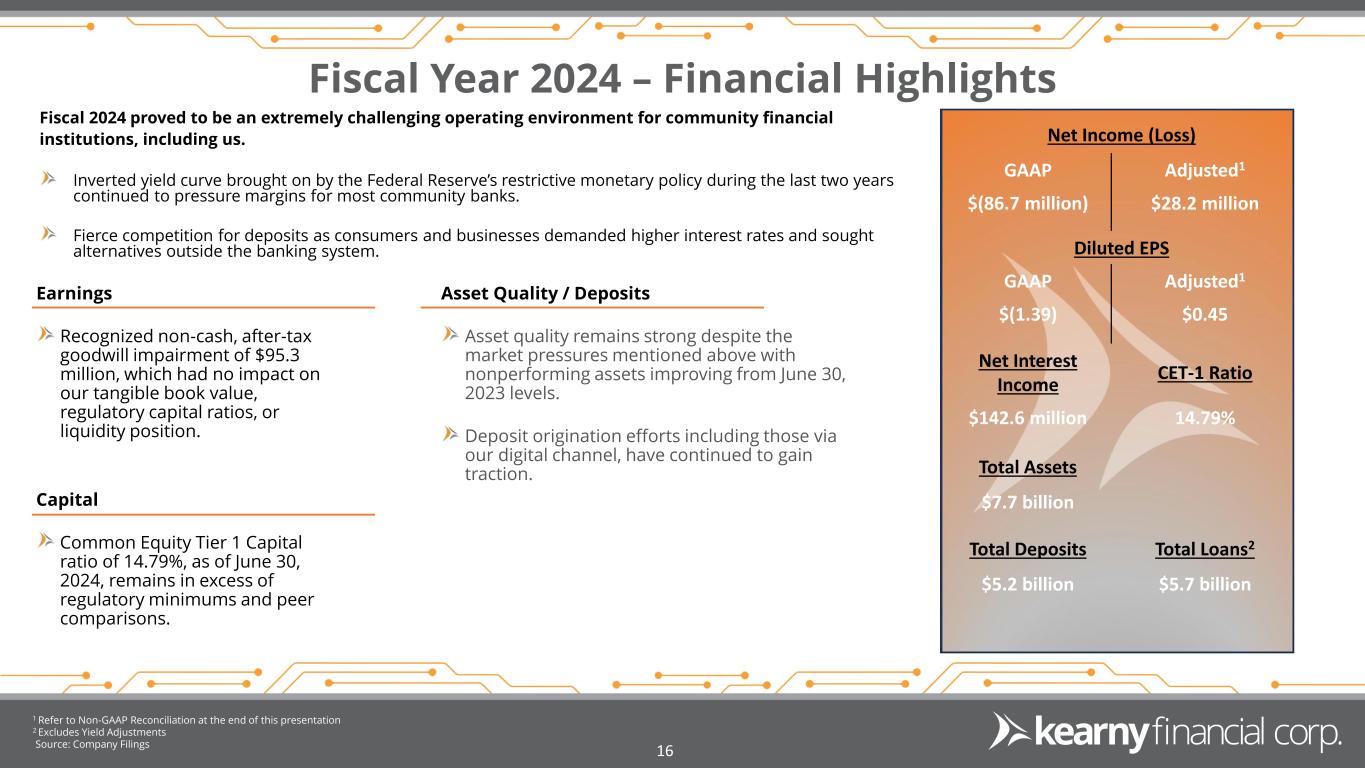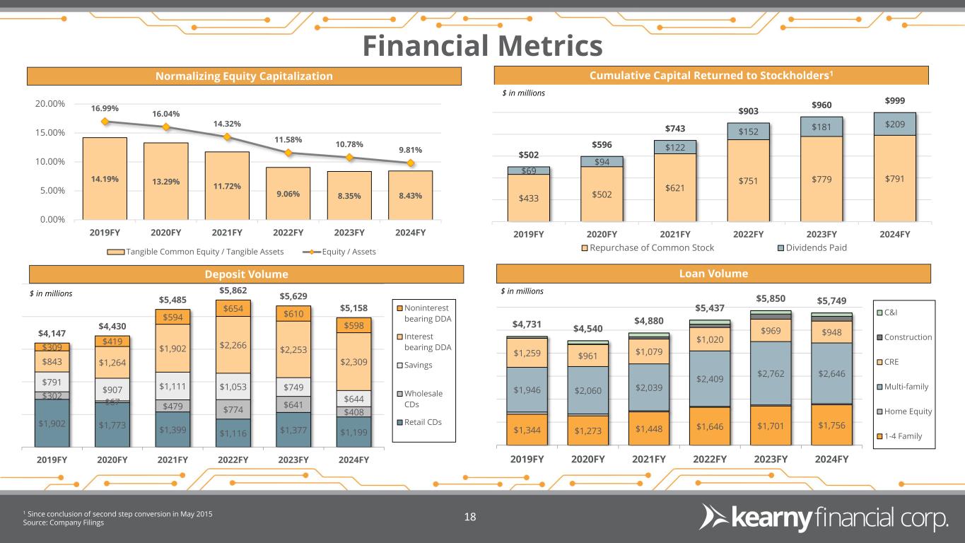 Forward Looking Statements & Non-GAAP Financial Measures 8 This presentation may include certain “forward-looking statements,” which are made in good faith by Kearny Financial Corp. (the “Company”) pursuant to the “safe harbor” provisions of the Private Securities Litigation Reform Act of 1995. These forward-looking statements are subject to risks and uncertainties, such as statements of the Company’s plans, objectives, expectations, estimates and intentions that are subject to change based on various important factors (some of which are beyond the Company’s control). In addition to the factors described under Item 1A. Risk Factors in the Company’s Annual Report on Form 10-K, and subsequent filings with the Securities and Exchange Commission, the following factors, among others, could cause the Company’s financial performance to differ materially from the plans, objectives, expectations, estimates and intentions expressed in such forward-looking statements: • the strength of the United States economy in general and the strength of the local economy in which the Company conducts operations, • the effects of and changes in, trade, monetary and fiscal policies and laws, including interest rate policies of the Board of Governors of the Federal Reserve System, inflation, interest rates, market and monetary fluctuations, • the impact of changes in laws, regulations and government policies regarding financial institutions (including laws concerning taxation, banking, securities and insurance), • changes in accounting policies and practices, as may be adopted by regulatory agencies, the Financial Accounting Standards Board (“FASB”) or the Public Company Accounting Oversight Board, • technological changes, • competition among financial services providers, and • the success of the Company at managing the risks involved in the foregoing and managing its business. The Company cautions that the foregoing list of important factors is not exhaustive. Readers should not place any undue reliance on any forward looking statements, which speak only as of the date made. The Company does not undertake any obligation to update any forward-looking statement, whether written or oral, that may be made from time to time by or on behalf of the Company. This presentation contains financial information determined by methods other than in accordance with accounting principles generally accepted in the United States of America (“GAAP”). Management uses these “non-GAAP” measures in its analysis of the Company’s performance. Management believes these non-GAAP financial measures allow for better comparability of period to period operating performance. Additionally, the Company believes this information is utilized by regulators and market analysts to evaluate a company’s financial condition and therefore, such information is useful to investors. These disclosures should not be viewed as a substitute for operating results determined in accordance with GAAP, nor are they necessarily comparable to non-GAAP performance measures that may be presented by other companies. A reconciliation of the non-GAAP measures used in this presentation to the most directly comparable GAAP measures is provided at the end of this presentation.