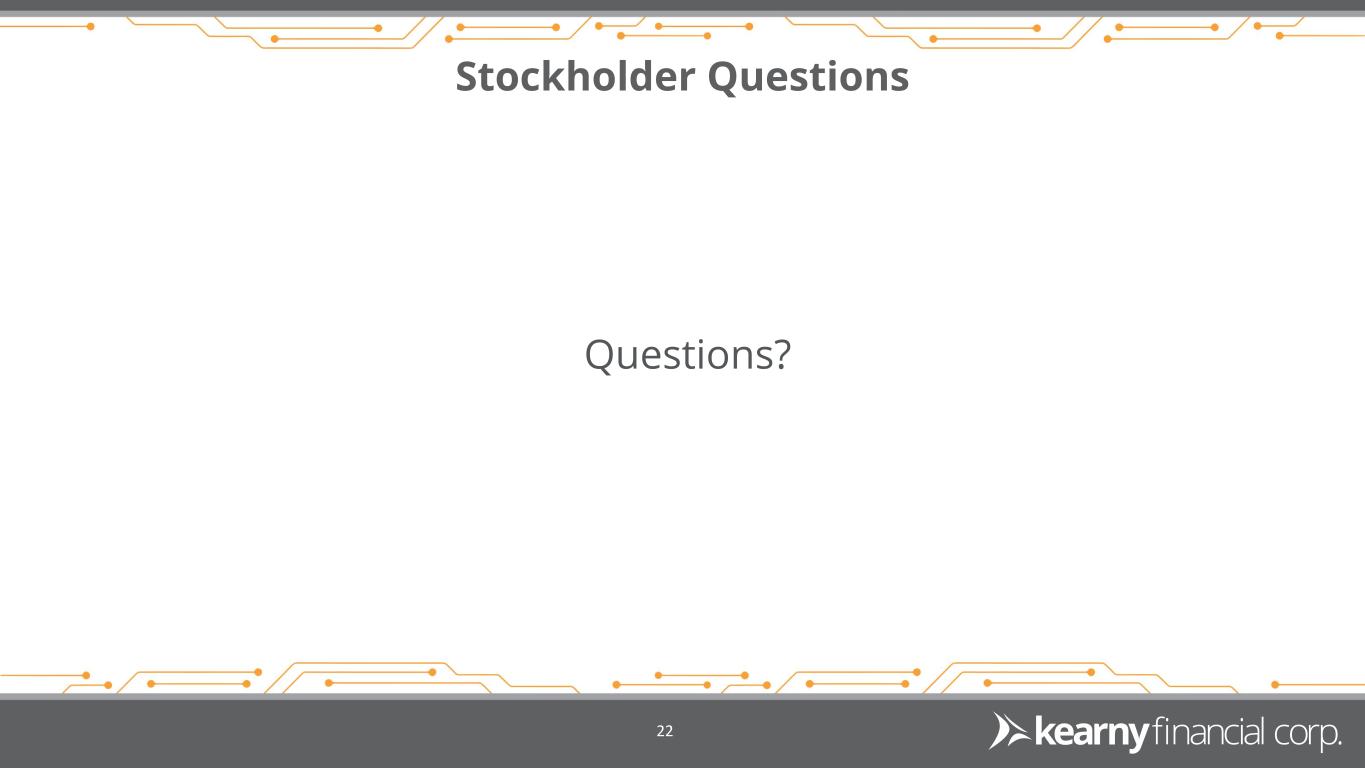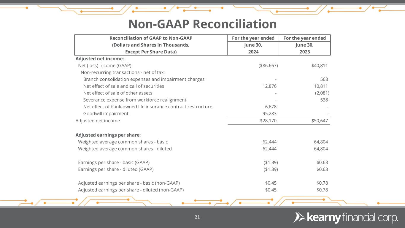 Non-GAAP Reconciliation 21 Reconciliation of GAAP to Non-GAAP For the year ended For the year ended (Dollars and Shares in Thousands, Except Per Share Data) June 30, 2024 June 30, 2023 Adjusted net income: Net (loss) income (GAAP) ($86,667) $40,811 Non-recurring transactions - net of tax: Branch consolidation expenses and impairment charges - 568 Net effect of sale and call of securities 12,876 10,811 Net effect of sale of other assets - (2,081) Severance expense from workforce realignment - 538 Net effect of bank-owned life insurance contract restructure 6,678 - Goodwill impairment 95,283 - Adjusted net income $28,170 $50,647 Adjusted earnings per share: Weighted average common shares - basic 62,444 64,804 Weighted average common shares - diluted 62,444 64,804 Earnings per share - basic (GAAP) ($1.39) $0.63 Earnings per share - diluted (GAAP) ($1.39) $0.63 Adjusted earnings per share - basic (non-GAAP) $0.45 $0.78 Adjusted earnings per share - diluted (non-GAAP) $0.45 $0.78