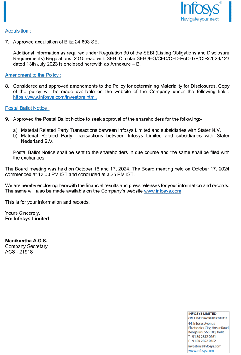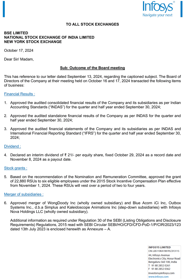 The Board of Directors of the Company amongst other matters, approved acquisition of Blitz 24-893 SE and approved merger of WongDoody Inc (wholly owned subsidiary) and Blue Acorn iCi Inc, Outbox Systems Inc., d.b.a Simplus and Kaleidoscope Animations Inc (step-down subsidiaries) with Infosys Nova Holdings LLC (wholly owned subsidiary).
