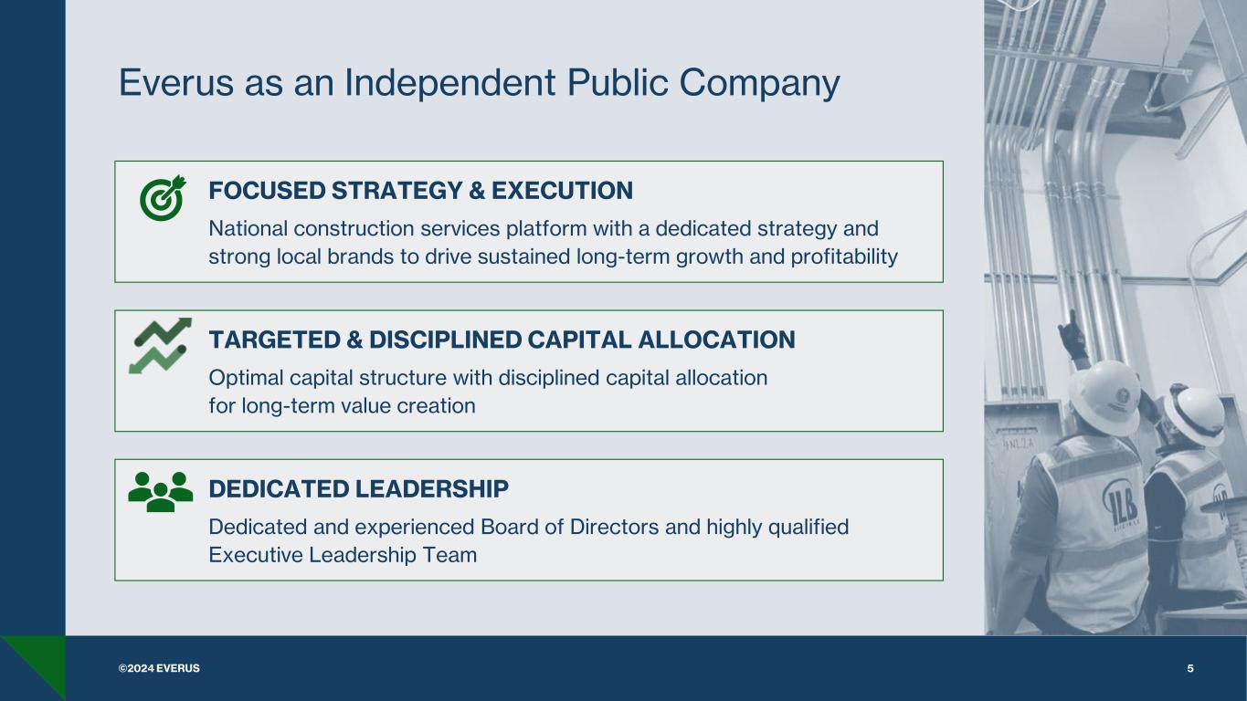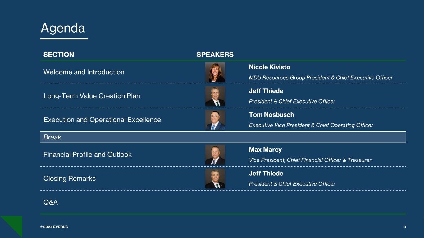 ©2024 EVERUS Forward-Looking Statements 2 This presentation and other materials Everus has filed or will file with the Securities and Exchange Commission ("SEC") (and oral communications that Everus may make) contain or incorporate by reference, or will contain or incorporate by reference, certain “forward-looking statements” within the meaning of the securities laws. All statements that reflect Everus’ expectations, assumptions or projections about the future, other than statements of historical facts, including, without limitation, statements regarding business strategies, market potential, future financial performance and other matters. The words “believe,” “expect,” “estimate,” “could,” “should,” “intend,” “may,” “plan,” “seek,” “anticipate,” “project” and similar expressions generally identify forward-looking statements, which speak only as of the date the statements were made. In particular, information included within this presentation contain forward-looking statements. The matters discussed in this presentation are subject to risks, uncertainties and other factors that could cause actual results to differ materially from those projected, anticipated or implied in the forward looking statements. Although Everus believes that the expectations reflected in any forward-looking statements it makes are based on reasonable assumptions, it can give no assurance that the expectation will be attained and it is possible that actual results may differ materially from those indicated by these forward-looking statements due to a variety of risks and uncertainties. Such risks and uncertainties include, but are not limited to: seasonality and adverse weather conditions; competition in Everus’ industry; the failure to retain current customers and obtain new customer contracts; changes in prices for commodities, labor, or other production and delivery inputs; Everus’ inability to hire, develop and retain key personnel and skilled labor forces; exposure to warranty claims; economic volatility; Everus’ inability to provide surety bonds; Everus’ backlog not accurately representing future revenue; supply chain disruptions; capital market and interest rates; increased financing costs due to possible Everus credit ratings, negative impacts from pending and/or future litigation, claims or investigations; liability resulting from Everus’ participation in multiemployer-defined benefit pension plans; increased health care plan costs; risks associated with the nonpayment and/or nonperformance of Everus’ customers and counterparties; increases or changes in income tax rates or tax- related laws; risks associated with import tariffs and/or other government mandates; new interpretations of or changes in the enforcement of the government regulatory framework; a cybersecurity incident or other disruptions in the availability of Everus’ computer systems or privacy breaches; artificial intelligence presents challenges that can impact Everus’ business by posing security risks to confidential or proprietary information and personal data; the pandemic’s potential impact on the United States, including the customer sectors Everus serves and governmental responses to the pandemic; the expected benefits and timing of the separation, and the risk that conditions to the separation will not be satisfied and/or that the separation will not be completed within the expected time frame, according to the expected terms or at all; the risk of increased costs from dis-synergies, costs of restructuring transactions and other costs incurred in connection with the separation; retention of existing management team members and the ability to obtain the necessary personnel as a result of the separation; the impact of the separation on Everus’ business, reaction of customers, employees and other parties to the separation; Everus’ leverage; risks associated with expected financing transactions undertaken in connection with the separation and risks associated with indebtedness incurred in connection with the separation; any failure by MDU Resources to perform its obligations under the various separation agreements to be entered into in connection with the separation and distribution; a determination by the IRS that the distribution or certain related transactions are taxable; the possibility that any consents or approvals required in connection with the separation will not be received or obtained within the expected time frame, on the expected terms or at all; and the impact of the separation on its businesses and the risk that the separation may be more difficult, time consuming or costly than expected, including the impact on its resources, systems, procedures and controls, diversion of management’s attention and the impact on relationships with customers, suppliers, employees and other business counterparties. The above list of factors is not exhaustive or necessarily in order of importance. For additional information on identifying factors that may cause actual results to vary materially from those stated in forward-looking statements, see the discussion under “Risk Factors” in the registration statement on Form 10 information statement. You should read this presentation completely and with the understanding that actual future results may be materially different from expectations. All forward-looking statements made in this presentation are qualified by these cautionary statements. These forward-looking statements are made only as of the date of this presentation, and Everus does not undertake any obligation, other than as may be required by law, to update or revise any forward-looking or cautionary statements to reflect changes in assumptions, the occurrence of events, unanticipated or otherwise, and changes in future operating results over time or otherwise. Comparisons of results for current and any prior periods are not intended to express any future tr