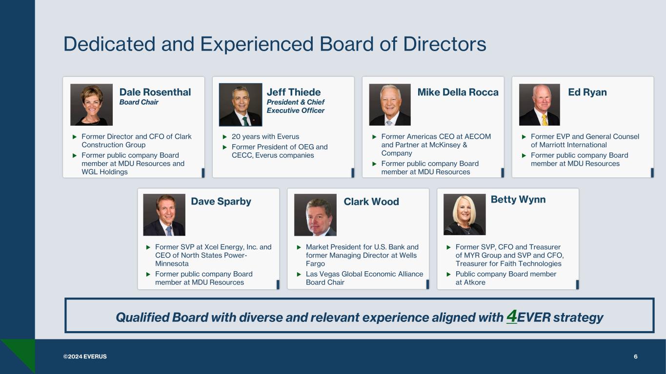 Dedicated and Experienced Board of Directors ©2024 EVERUS 6 Qualified Board with diverse and relevant experience aligned with 4EVER strategy Dale Rosenthal Board Chair Former Director and CFO of Clark Construction Group Former public company Board member at MDU Resources and WGL Holdings Market President for U.S. Bank and former Managing Director at Wells Fargo Las Vegas Global Economic Alliance Board Chair Clark Wood Ed Ryan Former EVP and General Counsel of Marriott International Former public company Board member at MDU Resources Dave Sparby Former SVP at Xcel Energy, Inc. and CEO of North States Power- Minnesota Former public company Board member at MDU Resources Former SVP, CFO and Treasurer of MYR Group and SVP and CFO, Treasurer for Faith Technologies Public company Board member at Atkore Betty Wynn Former Americas CEO at AECOM and Partner at McKinsey & Company Former public company Board member at MDU Resources Mike Della RoccaJeff Thiede President & Chief Executive Officer 20 years with Everus Former President of OEG and CECC, Everus companies