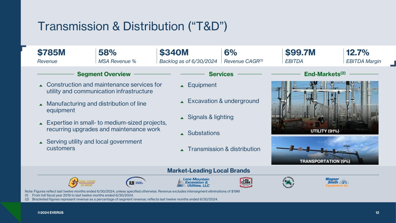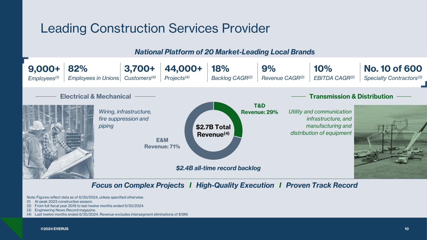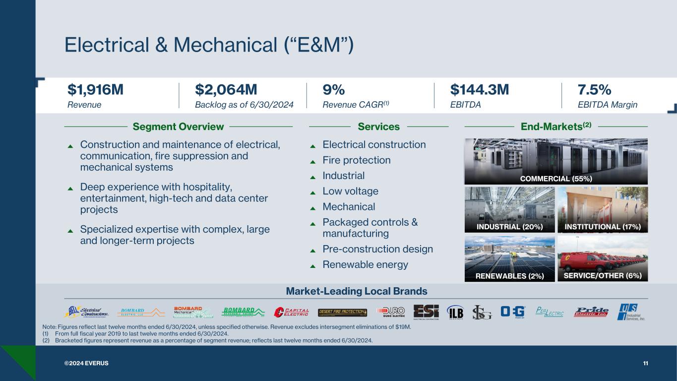 ©2024 EVERUS $2.7B Total Revenue(4) Wiring, infrastructure, fire suppression and piping National Platform of 20 Market-Leading Local Brands Electrical & Mechanical Note: Figures reflect data as of 6/30/2024, unless specified otherwise. (1) At peak 2023 construction season. (2) From full fiscal year 2019 to last twelve months ended 6/30/2024. (3) Engineering News-Record magazine. (4) Last twelve months ended 6/30/2024. Revenue excludes intersegment eliminations of $19M. Transmission & Distribution 10 Utility and communication infrastructure, and manufacturing and distribution of equipment E&M Revenue: 71% T&D Revenue: 29% Focus on Complex Projects I High-Quality Execution I Proven Track Record $2.4B all-time record backlog 9,000+ Employees(1) 82% Employees in Unions 3,700+ Customers(4) 44,000+ Projects(4) No. 10 of 600 Specialty Contractors(3) 9% Revenue CAGR(2) 10% EBITDA CAGR(2) 18% Backlog CAGR(2) Leading Construction Services Provider