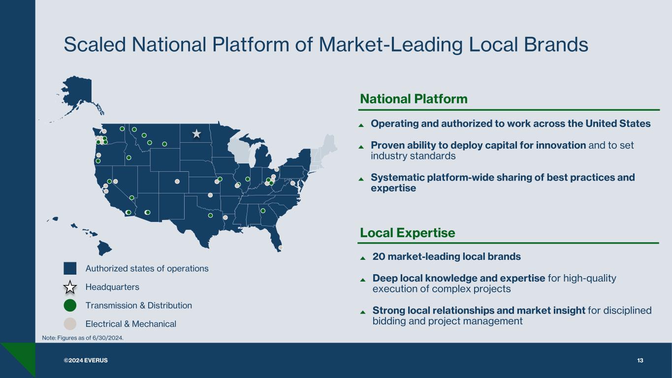 ©2024 EVERUS 12 Construction and maintenance services for utility and communication infrastructure Manufacturing and distribution of line equipment Expertise in small- to medium-sized projects, recurring upgrades and maintenance work Serving utility and local government customers Equipment Excavation & underground Signals & lighting Substations Transmission & distribution UTILITY (91%) TRANSPORTATION (9%) Segment Overview Services End-Markets(2) $785M Revenue $99.7M EBITDA $340M Backlog as of 6/30/2024 12.7% EBITDA Margin Market-Leading Local Brands 6% Revenue CAGR(1) Transmission & Distribution (“T&D”) 58% MSA Revenue % Note: Figures reflect last twelve months ended 6/30/2024, unless specified otherwise. Revenue excludes intersegment eliminations of $19M. (1) From full fiscal year 2019 to last twelve months ended 6/30/2024. (2) Bracketed figures represent revenue as a percentage of segment revenue; reflects last twelve months ended 6/30/2024.