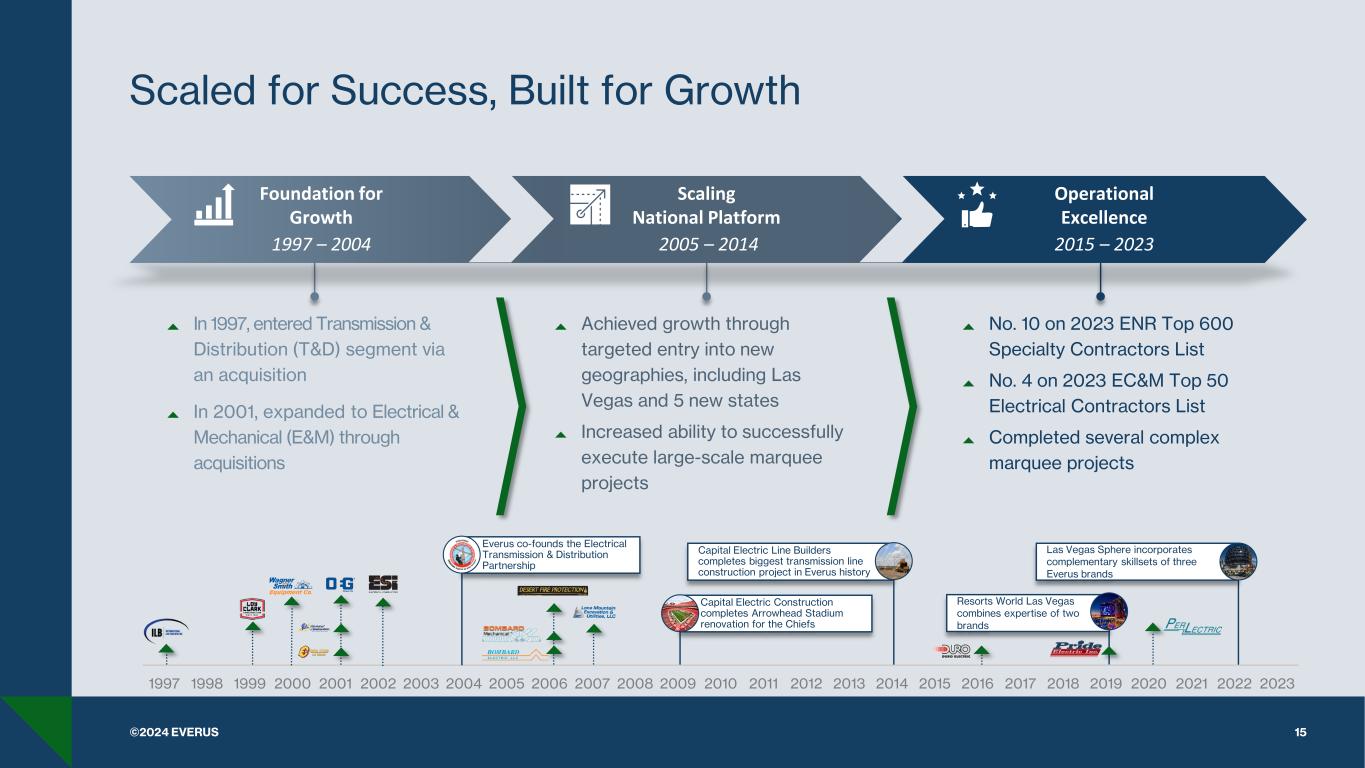 ©2024 EVERUS 14 Commercial Transportation Renewables $1,055M LTM Revenue 39% % of Contract Revenue $48M LTM Revenue 2% % of Contract Revenue $74M LTM Revenue 3% % of Contract Revenue Service & Other $106M LTM Revenue 4% % of Contract Revenue Note: Figures reflect last twelve months ended 6/30/2024. Excludes intersegment eliminations of $19M. Data centers Hospitality and entertainment Diversified commercial projects Electric vehicle charging Solar generation Energy storage markets Traffic signalization and street lighting Smaller projects, stand-alone or recurring maintenance Industrial $382M LTM Revenue 14% % of Contract Revenue High-tech manufacturing facilities Industrial installations, renovations, upgrades and expansions Education and government buildings Airports Health care InstitutionalUtility Overhead and underground electrical, gas and communication infrastructure $711M LTM Revenue 26% % of Contract Revenue $325M LTM Revenue 12% % of Contract Revenue Strong Positioning Across Diversified End-Markets