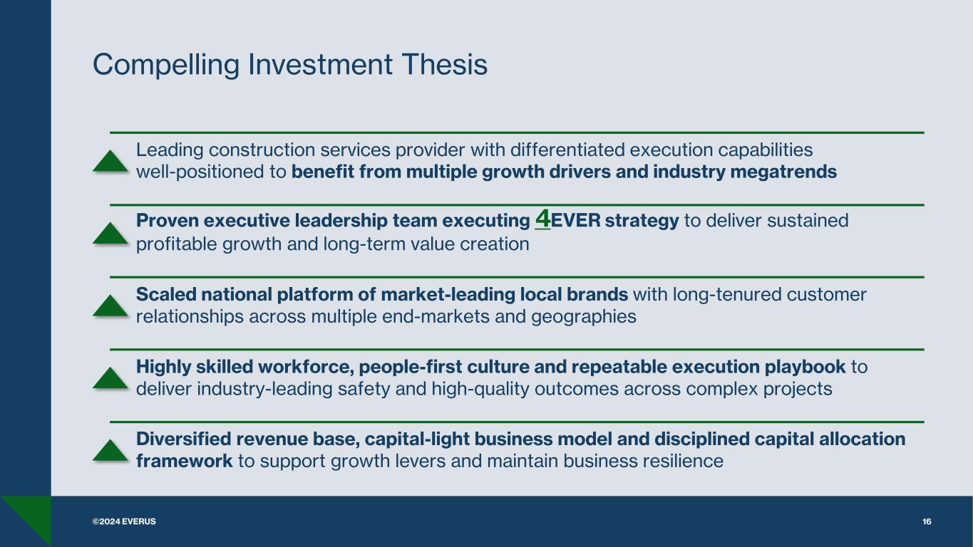 1997 1998 1999 2000 2001 2002 2003 2004 2005 2006 2007 2008 2009 2010 2011 2012 2013 2014 2015 2016 2017 2018 2019 2020 2021 2022 2023 Capital Electric Line Builders completes biggest transmission line construction project in Everus history ©2024 EVERUS 15 Scaled for Success, Built for Growth Scaling National Platform 2005 – 2014 Foundation for Growth 1997 – 2004 Operational Excellence 2015 – 2023 No. 10 on 2023 ENR Top 600 Specialty Contractors List No. 4 on 2023 EC&M Top 50 Electrical Contractors List Completed several complex marquee projects Achieved growth through targeted entry into new geographies, including Las Vegas and 5 new states Increased ability to successfully execute large-scale marquee projects In 1997, entered Transmission & Distribution (T&D) segment via an acquisition In 2001, expanded to Electrical & Mechanical (E&M) through acquisitions Capital Electric Construction completes Arrowhead Stadium renovation for the Chiefs Resorts World Las Vegas combines expertise of two brands Las Vegas Sphere incorporates complementary skillsets of three Everus brands Everus co-founds the Electrical Transmission & Distribution Partnership