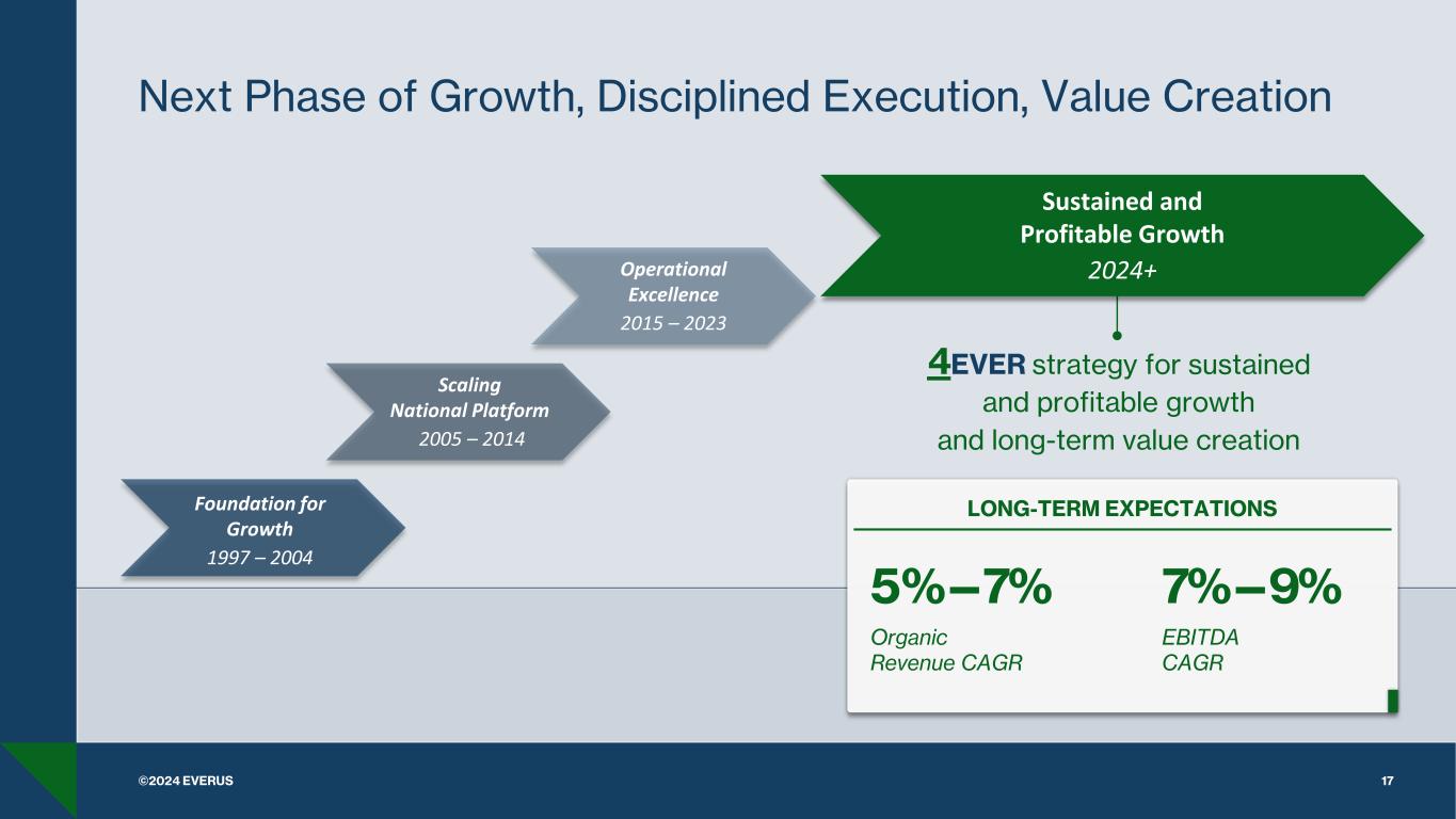 ©2024 EVERUS 16 Leading construction services provider with differentiated execution capabilities well-positioned to benefit from multiple growth drivers and industry megatrends Proven executive leadership team executing 4EVER strategy to deliver sustained profitable growth and long-term value creation Scaled national platform of market-leading local brands with long-tenured customer relationships across multiple end-markets and geographies Highly skilled workforce, people-first culture and repeatable execution playbook to deliver industry-leading safety and high-quality outcomes across complex projects Diversified revenue base, capital-light business model and disciplined capital allocation framework to support growth levers and maintain business resilience Compelling Investment Thesis