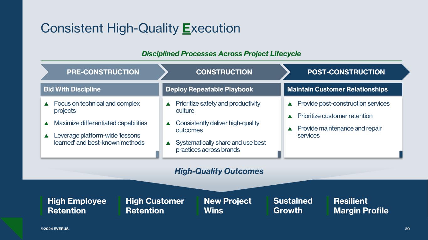 Highly Skilled Employees ©2024 EVERUS 19 ~28 Years Average Executive Tenure 100% Brand Presidents’ “Building Leaders” Program Completion 82% Union Workforce 9,000+ Employees(1) Strong Union Relationships Expertise & Technical Skills Extensive Experience Training Leadership Experienced executive team with deep expertise Train and mentor top leadership talent Highly skilled and flexible workforce; long-tenured union relationships Experienced and skilled on-site project managers, general foremen and foremen ensure delivery of best-in-class field execution ~11 Years Average General Foreman Tenure Note: Figures as of 6/30/2024, unless specified otherwise. (1) At peak 2023 construction season.