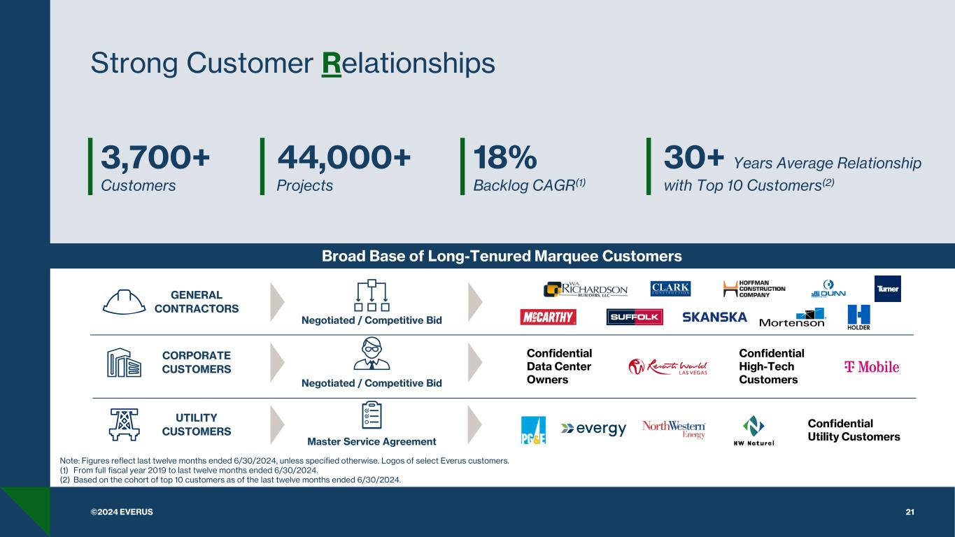 Consistent High-Quality Execution ©2024 EVERUS 20 PRE-CONSTRUCTION CONSTRUCTION POST-CONSTRUCTION Bid With Discipline Deploy Repeatable Playbook Maintain Customer Relationships High-Quality Outcomes Provide post-construction services Prioritize customer retention Provide maintenance and repair services Prioritize safety and productivity culture Consistently deliver high-quality outcomes Systematically share and use best practices across brands Focus on technical and complex projects Maximize differentiated capabilities Leverage platform-wide ‘lessons learned’ and best-known methods Disciplined Processes Across Project Lifecycle Resilient Margin Profile Sustained Growth New Project Wins High Employee Retention High Customer Retention