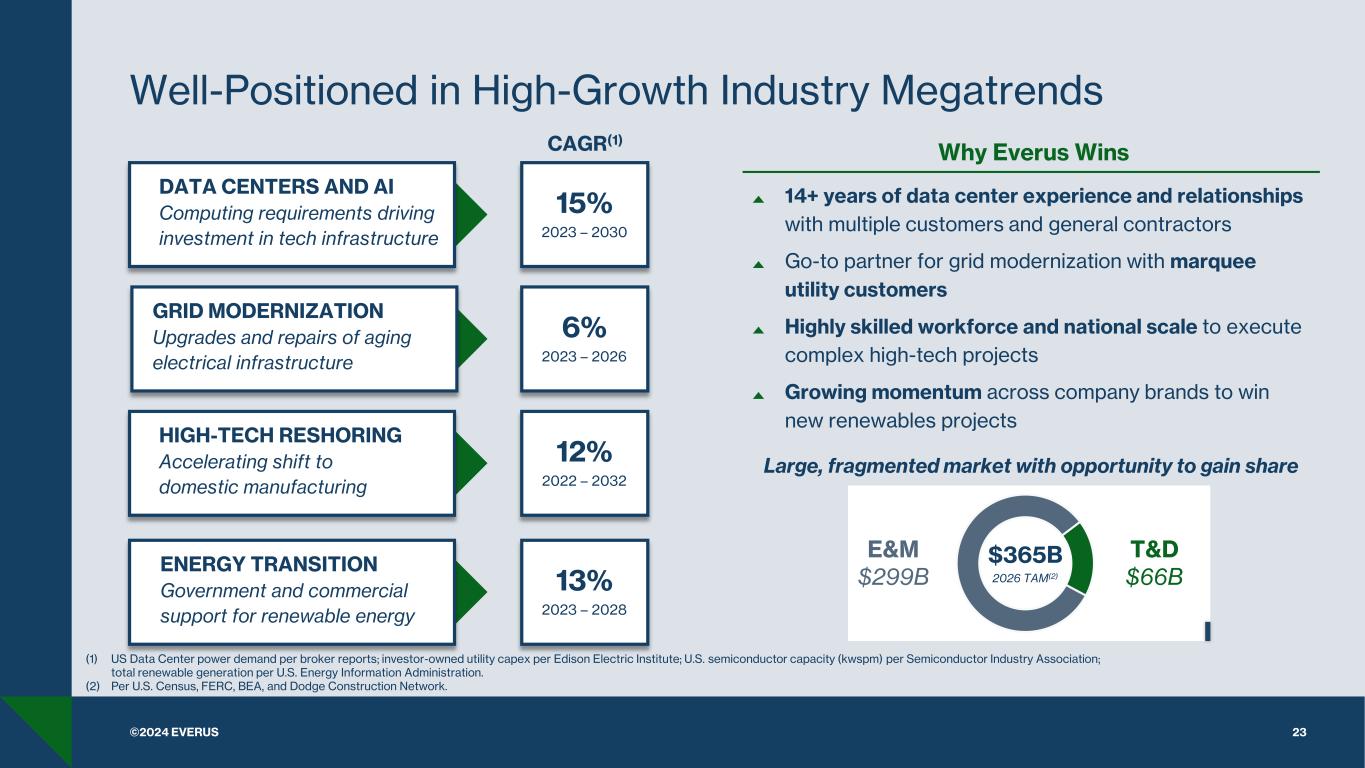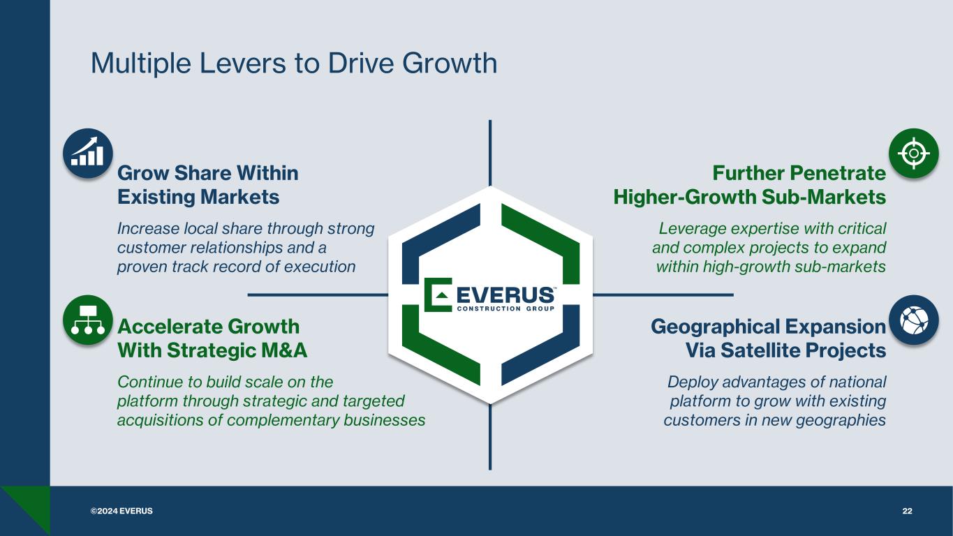 Multiple Levers to Drive Growth ©2024 EVERUS 22 Grow Share Within Existing Markets Increase local share through strong customer relationships and a proven track record of execution Further Penetrate Higher-Growth Sub-Markets Leverage expertise with critical and complex projects to expand within high-growth sub-markets Accelerate Growth With Strategic M&A Continue to build scale on the platform through strategic and targeted acquisitions of complementary businesses Geographical Expansion Via Satellite Projects Deploy advantages of national platform to grow with existing customers in new geographies