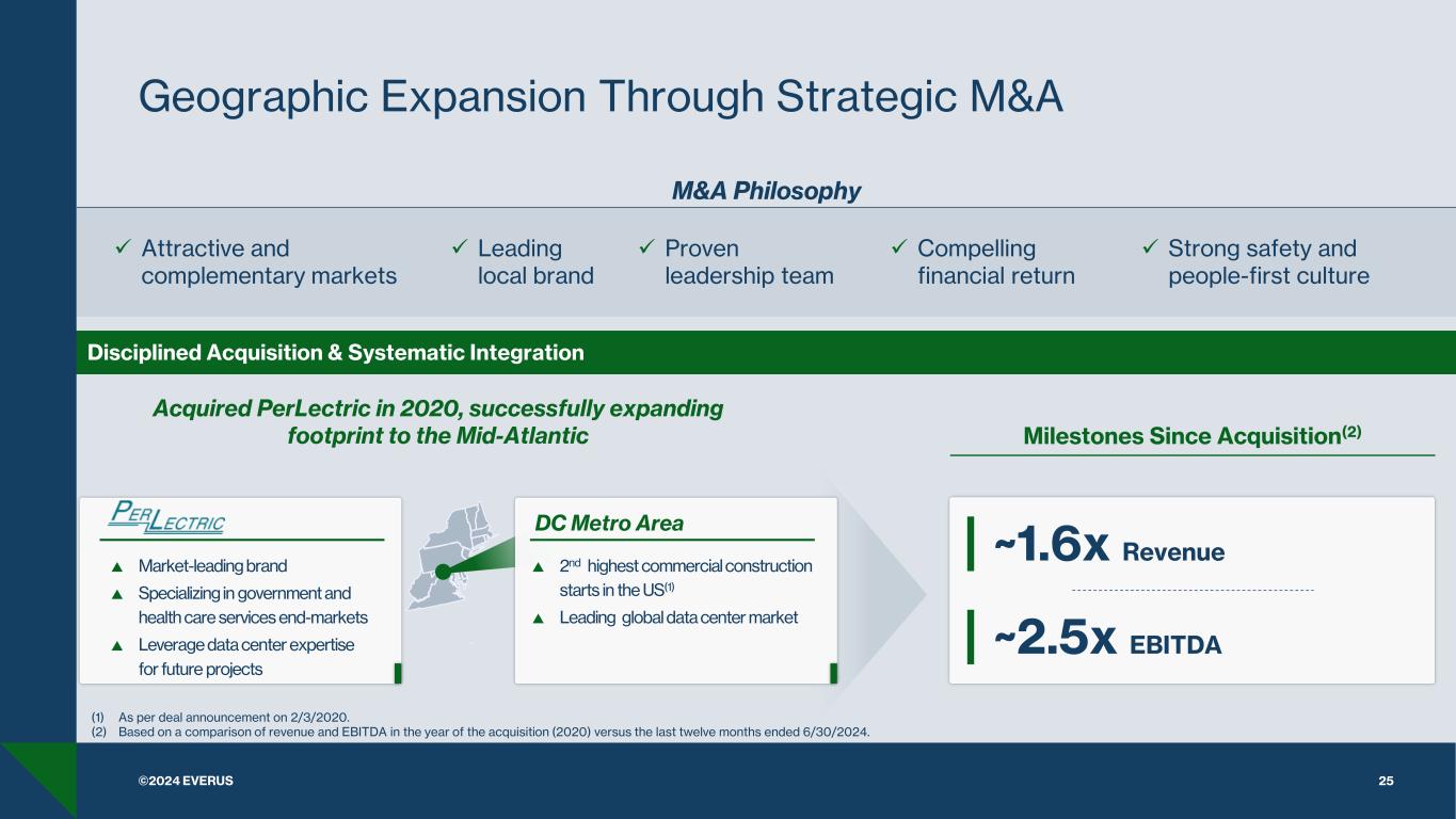 ©2024 EVERUS 24 Geographic Expansion Through Satellite Projects – Data Centers Highly skilled workforce and scaled solutions for consistent execution Building Blocks of Data Center Excellence and Expansion Extensive knowledge-sharing 14+ years of significant experience in the data center industry (1) Figures reflect last twelve months ended 6/30/2024. ~2x growth in data center backlog Growing Momentum – Last Twelve Months(1) ~2x increase in size of largest project Growing momentum in data center end-market, driven by unique capabilities and high-quality execution