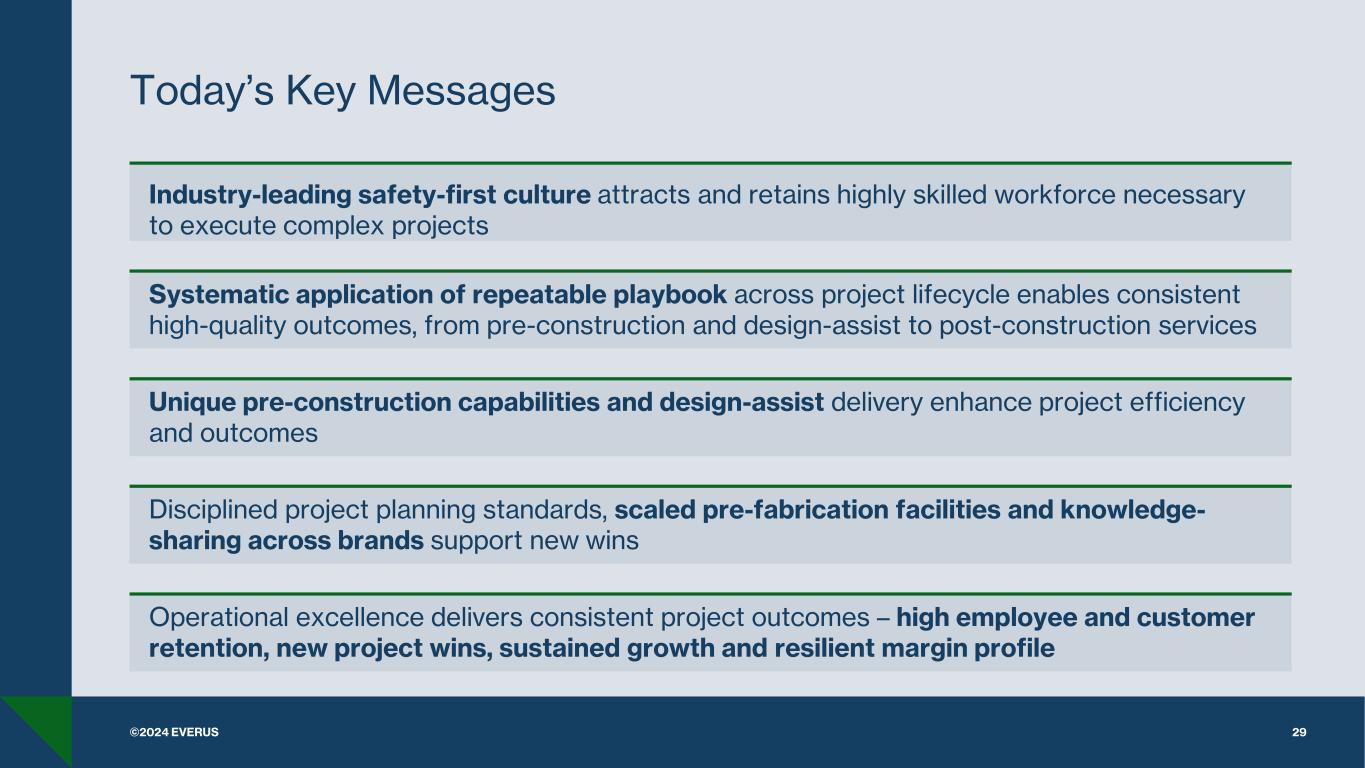 Systematic application of repeatable playbook across project lifecycle enables consistent high-quality outcomes, from pre-construction and design-assist to post-construction services ©2024 EVERUS 29 Industry-leading safety-first culture attracts and retains highly skilled workforce necessary to execute complex projects Unique pre-construction capabilities and design-assist delivery enhance project efficiency and outcomes Disciplined project planning standards, scaled pre-fabrication facilities and knowledge- sharing across brands support new wins Operational excellence delivers consistent project outcomes – high employee and customer retention, new project wins, sustained growth and resilient margin profile Today’s Key Messages