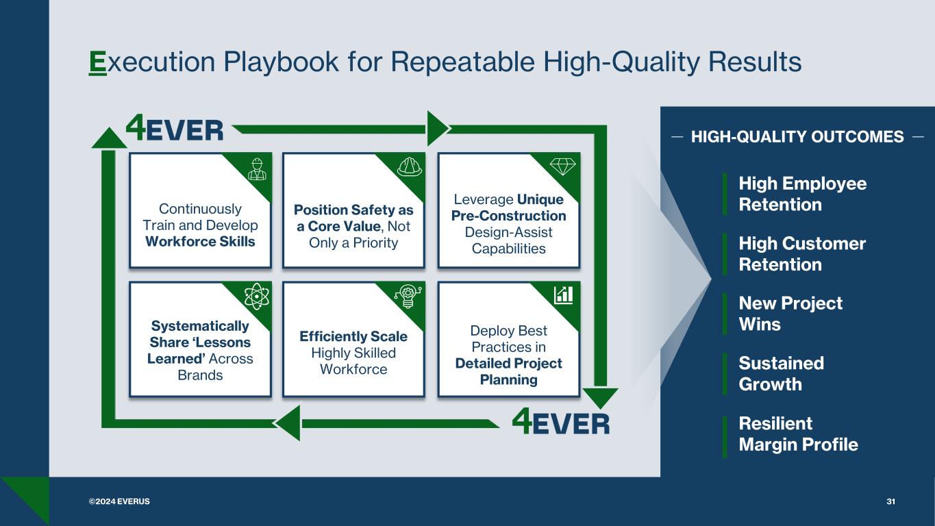 Total Recordable Incident Rate 1.29 1.72 Industry Average Days Away, Restricted or Transferred 0.60 1.00 Industry Average ©2024 EVERUS 30 Founding member of Electrical Transmission & Distribution Partnership, a collaboration of industry stakeholders working to improve safety Safety controls enforced at both local brand and company-wide levels Project safety monitored and evaluated from design to build Safety incorporated into brand presidents’ performance metrics Rigorous Approach to Safety Industry-Leading Safety Record Lost-Time Incident Rate 0.33 0.66 Industry Average Leading Safety Track Record Enables New Project Wins, Stronger Customer Relationships and Employee Retention People-First Culture With Industry-Leading Safety Focus Note: Figures reflect data as of 6/30/2024.
