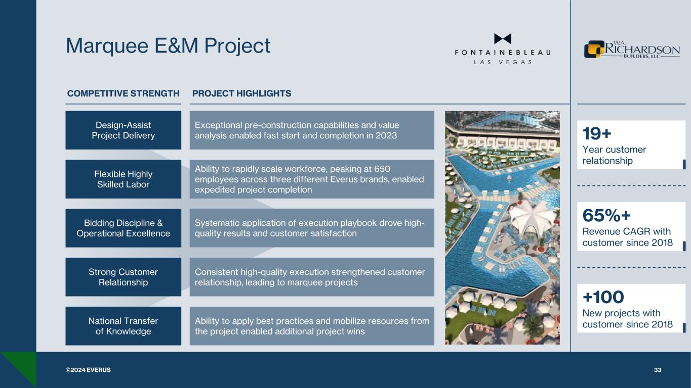 Project-planning standards that identify pre-fabrication opportunities Robust communication and knowledge- sharing between BIM/CAD(2) and pre- fabrication teams National scale and local presence allowing innovation at scale with local expertise Superior pre-fabrication quality, lowering costs and strengthening ability to win new projects High exposure to complex projects benefiting the most from pre-fabrication ©2024 EVERUS 32 Early Adopter of Pre-Fabrication Improved safety Greater labor efficiency and lower labor costs Faster project completion Enhanced quality of project execution Increased ability to control project outcomes Benefits of Pre-Fabrication Why Everus Wins 14 pre-fabrication facilities Pre-Fabrication Drives Productivity and Cost Savings 21% CAGR in cost savings to customers since 2019(1) (1) Reflects CAGR between full year 2019 and last twelve months ended 6/30/2024. (2) ‘BIM’ Building Information Modeling; ‘CAD’ Computer Aided Design.
