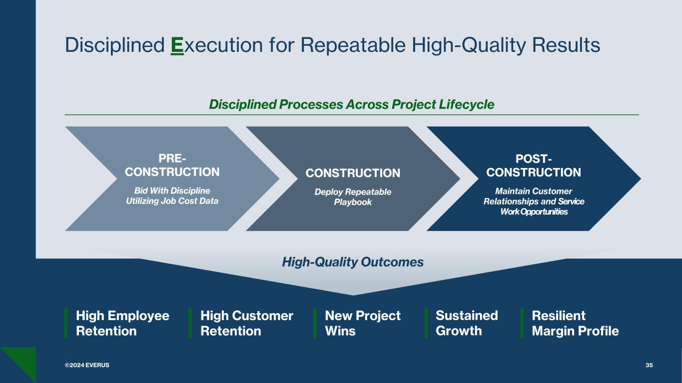 ©2024 EVERUS 34 PROJECT HIGHLIGHTS COMPETITIVE STRENGTH 26+ Year customer relationship 22%+ Revenue CAGR with customer since 2018 +250 New projects with customer since 2018 Strong Customer Relationship Breadth of Capabilities Expertise With Complex Projects 26+ year customer relationship with significant and predictable MSA project work Providing full scope of services across T&D, including reconductoring, pole change outs, and emergency response Partnering on multi-year strategic projects – result of large commitment to reduce wildfire risk Undergrounding power and communications knowledge transferred throughout Everus Efficient and Safe Operations Consistently exceeding PG&E’s priority KPI of contractor benchmarks for safety; 0 safety KPI incidents YTD Decades-Long T&D Relationship National Transfer of Knowledge