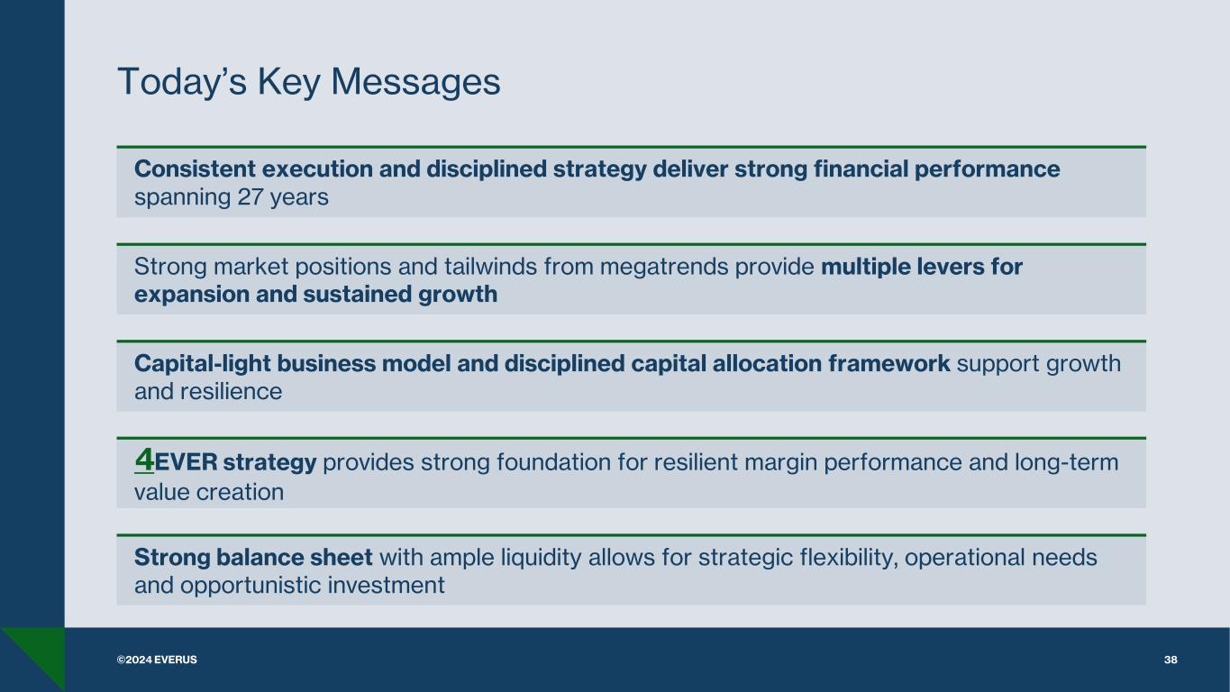 Today’s Key Messages Consistent execution and disciplined strategy deliver strong financial performance spanning 27 years Strong market positions and tailwinds from megatrends provide multiple levers for expansion and sustained growth Capital-light business model and disciplined capital allocation framework support growth and resilience 4EVER strategy provides strong foundation for resilient margin performance and long-term value creation Strong balance sheet with ample liquidity allows for strategic flexibility, operational needs and opportunistic investment 38©2024 EVERUS