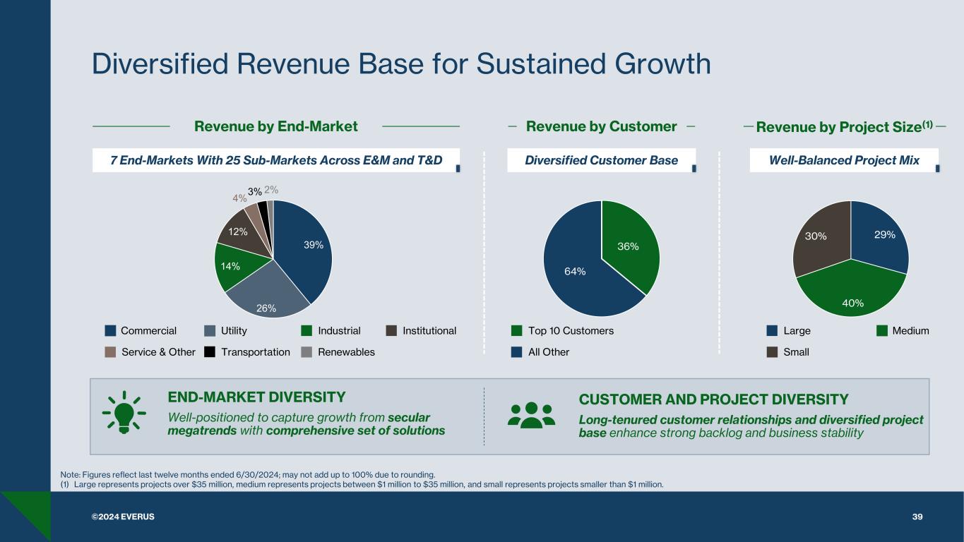 36% 64% END-MARKET DIVERSITY Well-positioned to capture growth from secular megatrends with comprehensive set of solutions CUSTOMER AND PROJECT DIVERSITY Long-tenured customer relationships and diversified project base enhance strong backlog and business stability ©2024 EVERUS 39 Revenue by Customer Revenue by Project Size(1) 29% 40% 30% Note: Figures reflect last twelve months ended 6/30/2024; may not add up to 100% due to rounding. (1) Large represents projects over $35 million, medium represents projects between $1 million to $35 million, and small represents projects smaller than $1 million. Diversified Customer Base Well-Balanced Project Mix MediumLarge SmallAll Other Top 10 Customers Diversified Revenue Base for Sustained Growth 39% 26% 14% 12% 4%3% 2% Revenue by End-Market Utility Transportation Commercial Industrial Institutional Service & Other Renewables 7 End-Markets With 25 Sub-Markets Across E&M and T&D