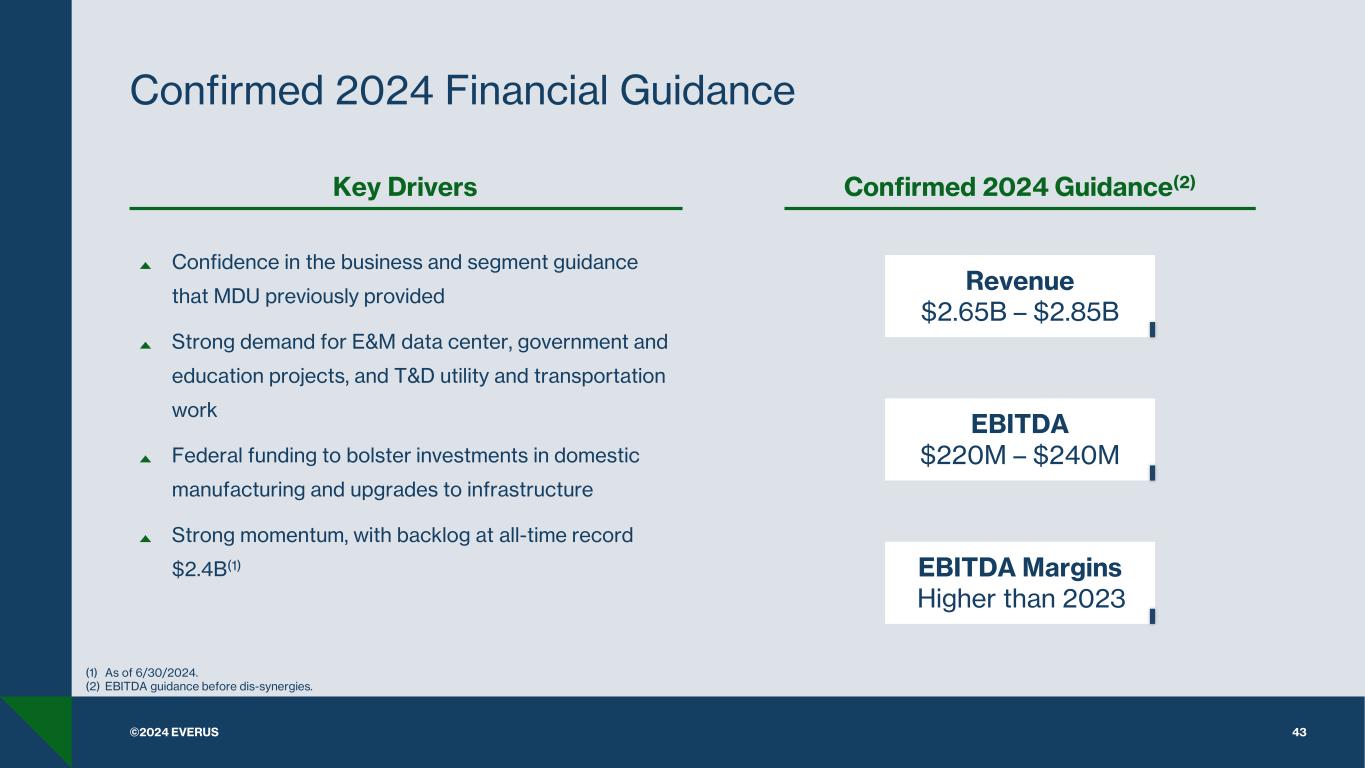 7.9% 8.3% 8.2% 7.2% 7.8% 8.4% 2019 2020 2021 2022 2023 LTM 5-Year Avg. EBITDA Margin: 7.9%(2) Profitable Growth With a Resilient Margin Profile ©2024 EVERUS 42 Bid Discipline and Operational Excellence Enable Resilient Margin Profile … … In Turn Driving Sustained and Profitable Growth EBITDA $ in millions EBITDA Margins(1) $145 $173 $169 $193 $223 $225 2019 2020 2021 2022 2023 LTM EBITDA(1) (1) Total EBITDA including Corporate Overhead. (2) 5-year avg. EBITDA Margin and EBITDA CAGR are based on EBITDA before dis-synergies. (3) Reflects last twelve months ended 6/30/2024. (3) (3)