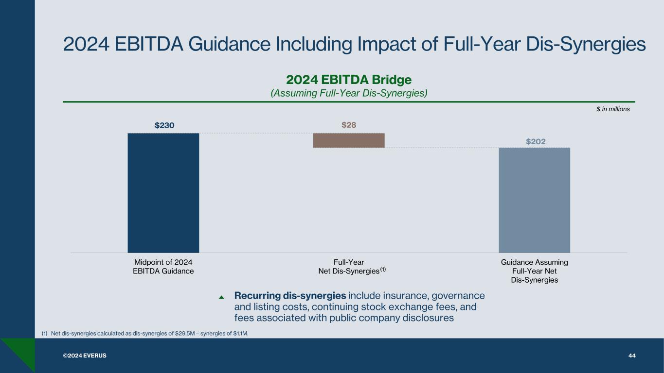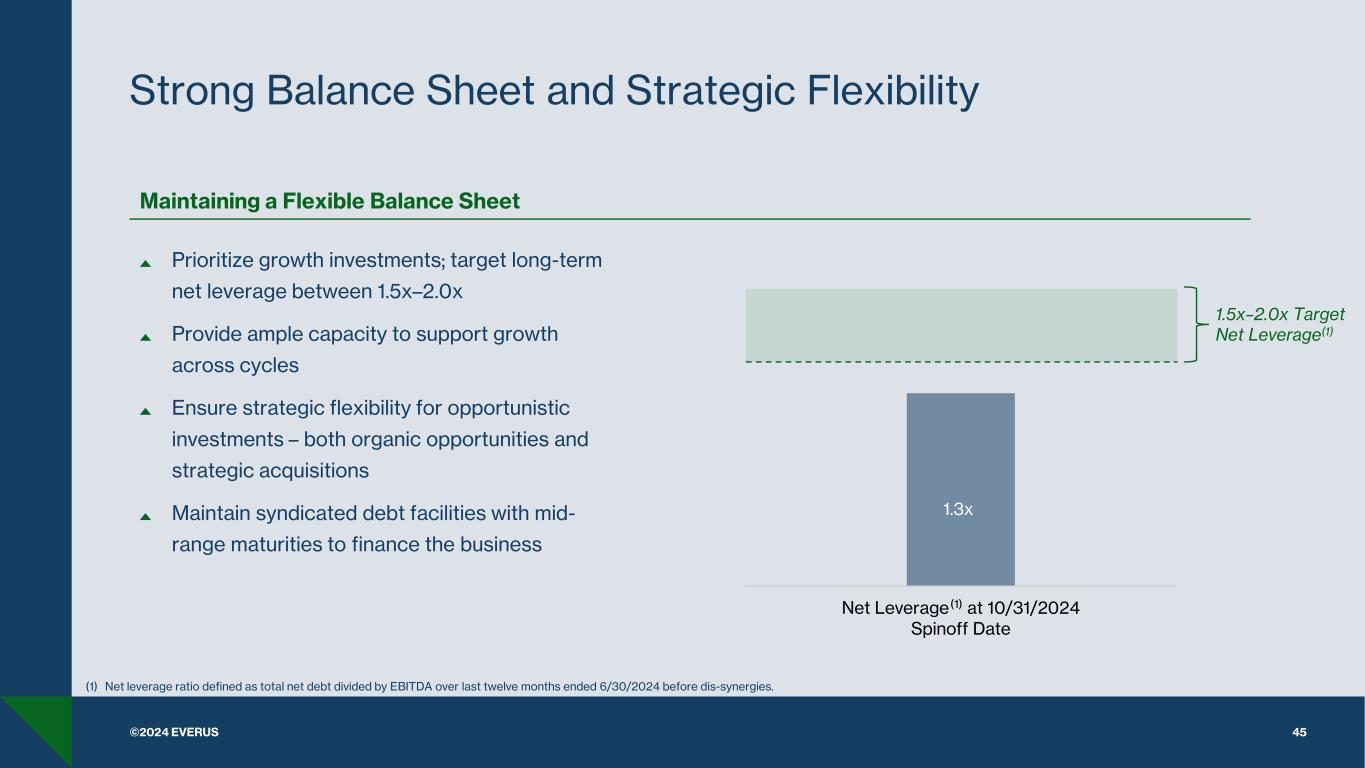 ©2024 EVERUS 44 2024 EBITDA Guidance Including Impact of Full-Year Dis-Synergies $ in millions $230 $202 $28 Midpoint of 2024 EBITDA Guidance Full-Year Net Dis-Synergies Guidance Assuming Full-Year Net Dis-Synergies 2024 EBITDA Bridge (Assuming Full-Year Dis-Synergies) Recurring dis-synergies include insurance, governance and listing costs, continuing stock exchange fees, and fees associated with public company disclosures (1) (1) Net dis-synergies calculated as dis-synergies of $29.5M – synergies of $1.1M.