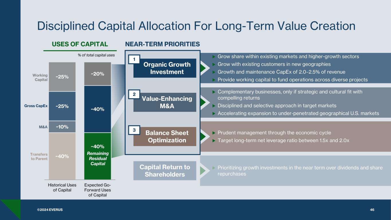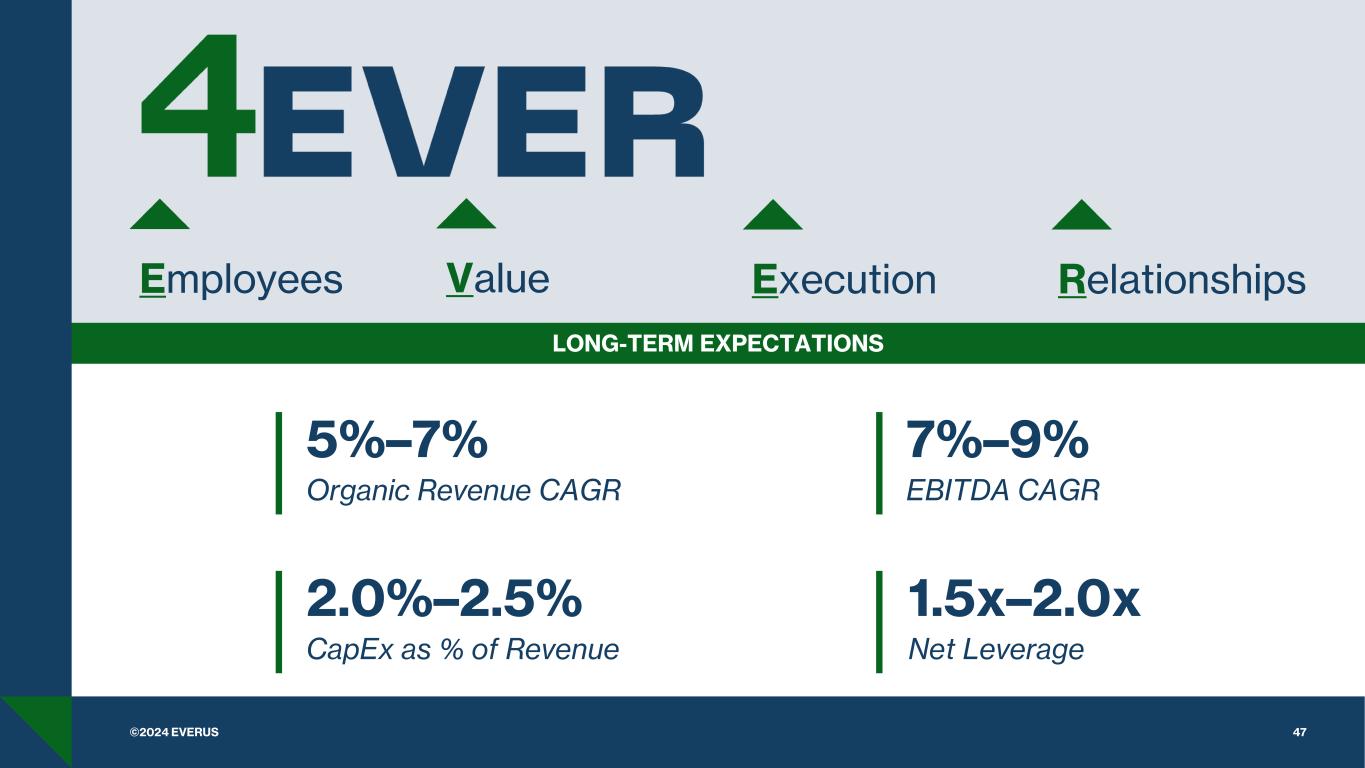 Disciplined Capital Allocation For Long-Term Value Creation ©2024 EVERUS 46 Prudent management through the economic cycle Target long-term net leverage ratio between 1.5x and 2.0x Complementary businesses, only if strategic and cultural fit with compelling returns Disciplined and selective approach in target markets Accelerating expansion to under-penetrated geographical U.S. markets Grow share within existing markets and higher-growth sectors Grow with existing customers in new geographies Growth and maintenance CapEx of 2.0–2.5% of revenue Provide working capital to fund operations across diverse projects Capital Return to Shareholders NEAR-TERM PRIORITIES Organic Growth Investment 1 Value-Enhancing M&A 2 Balance Sheet Optimization 3 Prioritizing growth investments in the near term over dividends and share repurchases ~40% ~40% ~10% ~25% ~40% ~25% ~20% Historical Uses of Capital Expected Go- Forward Uses of Capital USES OF CAPITAL % of total capital uses Remaining Residual Capital Working Capital Gross CapEx M&A Transfers to Parent