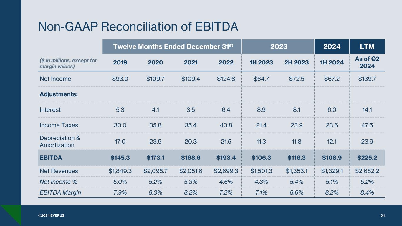 Non-GAAP Financial Guidance ©2024 EVERUS 53 Our forward-looking guidance for EBITDA, EBITDA Margin and long-term net leverage are non-GAAP financial measures that exclude or otherwise have been adjusted for special items from our U.S. GAAP financial statements. We are unable to reconcile forward-looking non-GAAP guidance measures to their nearest U.S. GAAP measure because we are unable to predict the timing of these adjustments with a reasonable degree of certainty. By their very nature, special and other non-core items are difficult to anticipate with precision because they are generally associated with unexpected and unplanned events that impact our company and its financial results. Therefore, we are unable to provide a reconciliation of these non-GAAP financial metrics without unreasonable efforts.