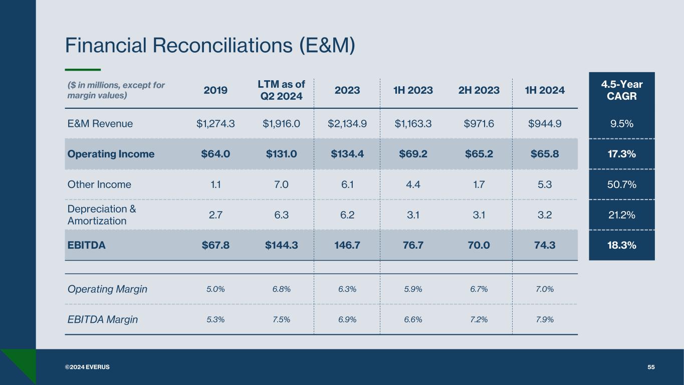 Twelve Months Ended December 31st 2023 2024 LTM ($ in millions, except for margin values) 2019 2020 2021 2022 1H 2023 2H 2023 1H 2024 As of Q2 2024 Net Income $93.0 $109.7 $109.4 $124.8 $64.7 $72.5 $67.2 $139.7 Adjustments: Interest 5.3 4.1 3.5 6.4 8.9 8.1 6.0 14.1 Income Taxes 30.0 35.8 35.4 40.8 21.4 23.9 23.6 47.5 Depreciation & Amortization 17.0 23.5 20.3 21.5 11.3 11.8 12.1 23.9 EBITDA $145.3 $173.1 $168.6 $193.4 $106.3 $116.3 $108.9 $225.2 Net Revenues $1,849.3 $2,095.7 $2,051.6 $2,699.3 $1,501.3 $1,353.1 $1,329.1 $2,682.2 Net Income % 5.0% 5.2% 5.3% 4.6% 4.3% 5.4% 5.1% 5.2% EBITDA Margin 7.9% 8.3% 8.2% 7.2% 7.1% 8.6% 8.2% 8.4% ©2024 EVERUS Non-GAAP Reconciliation of EBITDA 54