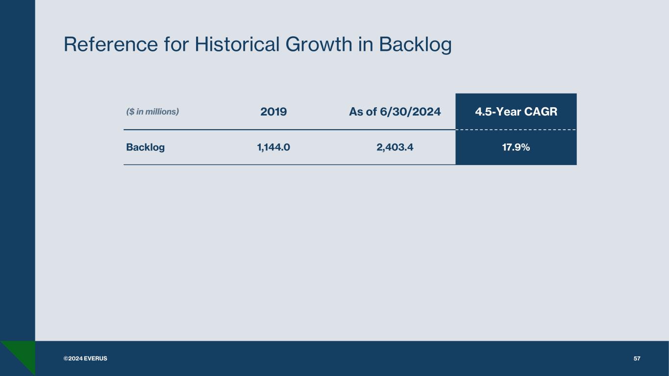 ©2024 EVERUS Reference for Historical Growth in Backlog ($ in millions) 2019 As of 6/30/2024 4.5-Year CAGR Backlog 1,144.0 2,403.4 17.9% 57