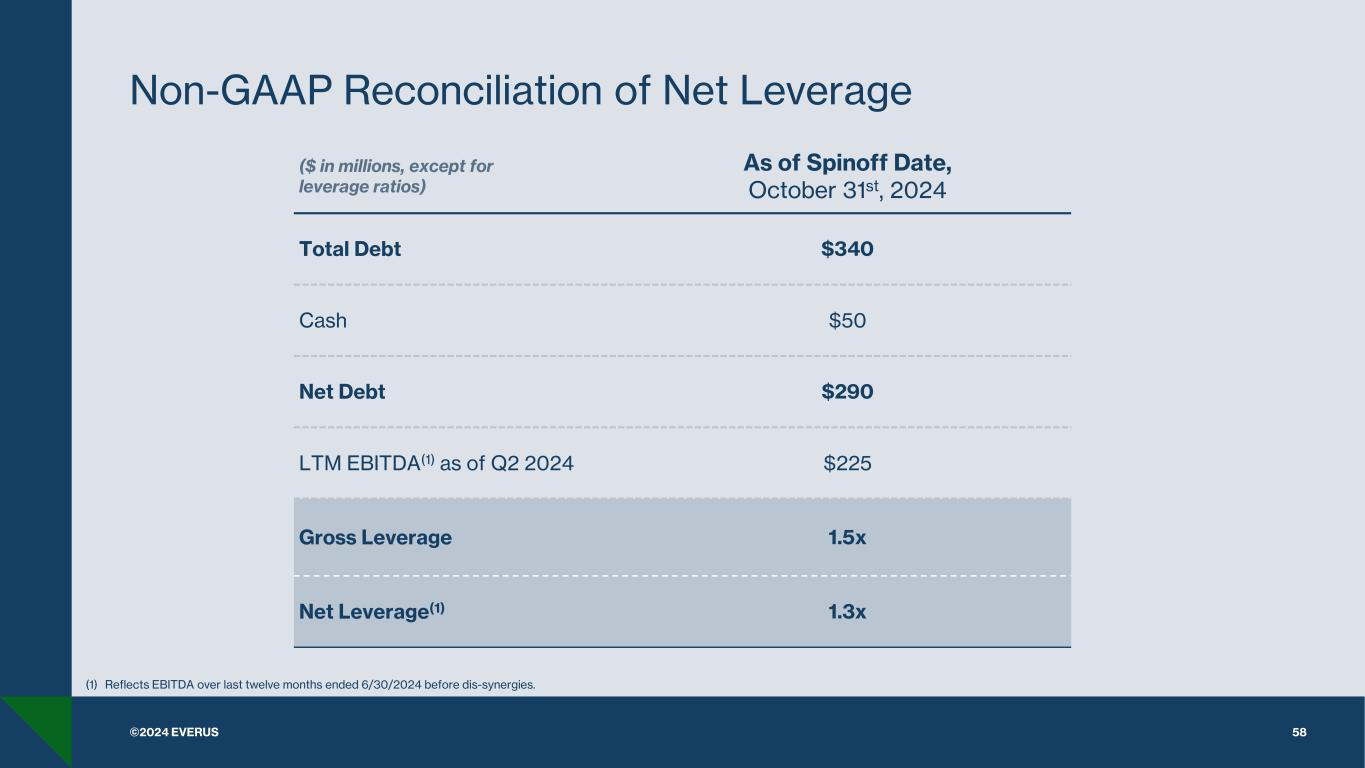 ($ in millions, except for leverage ratios) As of Spinoff Date, October 31st, 2024 Total Debt $340 Cash $50 Net Debt $290 LTM EBITDA(1) as of Q2 2024 $225 Gross Leverage 1.5x Net Leverage(1) 1.3x ©2024 EVERUS Non-GAAP Reconciliation of Net Leverage (1) Reflects EBITDA over last twelve months ended 6/30/2024 before dis-synergies. 58