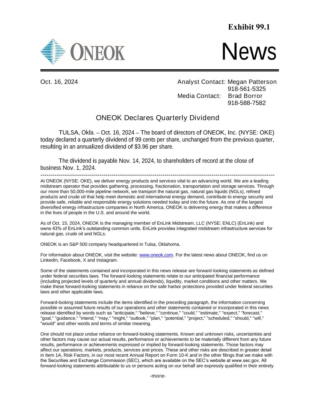 -more- News ONEOK Declares Quarterly Dividend TULSA, Okla. – Oct. 16, 2024 – The board of directors of ONEOK, Inc. (NYSE: OKE) today declared a quarterly dividend of 99 cents per share, unchanged from the previous quarter, resulting in an annualized dividend of $3.96 per share. The dividend is payable Nov. 14, 2024, to shareholders of record at the close of business Nov. 1, 2024. ------------------------------------------------------------------------------------------------------------------- At ONEOK (NYSE: OKE), we deliver energy products and services vital to an advancing world. We are a leading midstream operator that provides gathering, processing, fractionation, transportation and storage services. Through our more than 50,000-mile pipeline network, we transport the natural gas, natural gas liquids (NGLs), refined products and crude oil that help meet domestic and international energy demand, contribute to energy security and provide safe, reliable and responsible energy solutions needed today and into the future. As one of the largest diversified energy infrastructure companies in North America, ONEOK is delivering energy that makes a difference in the lives of people in the U.S. and around the world. As of Oct. 15, 2024, ONEOK is the managing member of EnLink Midstream, LLC (NYSE: ENLC) (EnLink) and owns 43% of EnLink’s outstanding common units. EnLink provides integrated midstream infrastructure services for natural gas, crude oil and NGLs. ONEOK is an S&P 500 company headquartered in Tulsa, Oklahoma. For information about ONEOK, visit the website: www.oneok.com. For the latest news about ONEOK, find us on LinkedIn, Facebook, X and Instagram. Some of the statements contained and incorporated in this news release are forward-looking statements as defined under federal securities laws. The forward-looking statements relate to our anticipated financial performance (including projected levels of quarterly and annual dividends), liquidity, market conditions and other matters. We make these forward-looking statements in reliance on the safe harbor protections provided under federal securities laws and other applicable laws. Forward-looking statements include the items identified in the preceding paragraph, the information concerning possible or assumed future results of our operations and other statements contained or incorporated in this news release identified by words such as "anticipate," "believe," "continue," "could," "estimate," "expect," "forecast," "goal," "guidance," "intend," "may," "might," “outlook,” "plan," "potential," "project," "scheduled," "should," "will," "would" and other words and terms of similar meaning. One should not place undue reliance on forward-looking statements. Known and unknown risks, uncertainties and other factors may cause our actual results, performance or achievements to be materially different from any future results, performance or achievements expressed or implied by forward-looking statements. Those factors may affect our operations, markets, products, services and prices. These and other risks are described in greater detail in Item 1A, Risk Factors, in our most recent Annual Report on Form 10-K and in the other filings that we make with the Securities and Exchange Commission (SEC), which are available on the SEC’s website at www.sec.gov. All forward-looking statements attributable to us or persons acting on our behalf are expressly qualified in their entirety Oct. 16, 2024 Analyst Contact: Megan Patterson 918-561-5325 Media Contact: Brad Borror 918-588-7582 Exhibit 99.1