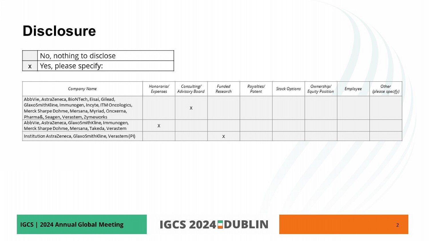 IGCS | 2024 Annual Global Meeting Disclosure No, nothing to disclose Yes, please specify: x Other (please specify) Employee Ownership/ Equity Position Stock Options Royalties/ Patent Funded Research Consulting/ Advisory Board Honoraria/ Expenses Company Name x AbbVie, AstraZeneca, BioNTech, Eisai, Gilead, GlaxoSmithKline, Immunogen, Incyte, ITM Oncologics , Merck Sharpe Dohme, Mersana, Myriad, Oncxerna , Pharma&, Seagen , Verastem, Zymeworks x AbbVie, AstraZeneca, GlaxoSmithKline, Immunogen, Merck Sharpe Dohme, Mersana, Takeda, Verastem x Institution AstraZeneca, GlaxoSmithKline, Verastem (PI) 2