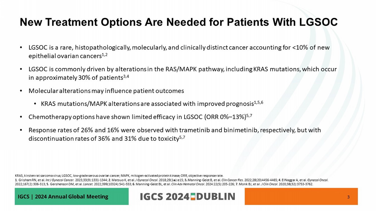 IGCS | 2024 Annual Global Meeting • LGSOC is a rare, histopathologically, molecularly, and clinically distinct cancer accounting for <10% of new epithelial ovarian cancers 1,2 • LGSOC is commonly driven by alterations in the RAS/MAPK pathway, including KRAS mutations, which occur in approximately 30% of patients 3,4 • Molecular alterations may influence patient outcomes • KRAS mutations/MAPK alterations are associated with improved prognosis 1,5,6 • Chemotherapy options have shown limited efficacy in LGSOC (ORR 0% – 13%) 5,7 • Response rates of 26% and 16% were observed with trametinib and binimetinib , respectively, but with discontinuation rates of 36% and 31% due to toxicity 5,7 3 New Treatment Options Are Needed for Patients With LGSOC KRAS, kirsten rat sarcoma virus; LGSOC, low - grade serous ovarian cancer; MAPK, mitogen - activated protein kinase; ORR, objective response rate. 1 . Grisham RN, et al. Int J Gynecol Cancer. 2023;33(9):1331 - 1344; 2 . Matsuo K, et al. J Gynecol Oncol . 2018;29(1 a ):e15 ; 3 . Manning - Geist B, et al. Clin Cancer Res . 2022;28(20)4456 - 4465 ; 4 . ElNaggar A, et al. Gynecol Oncol. 2022;167(2):306 - 313; 5 . Gershenson DM, et al. Lancet. 2022;399(10324):541 - 553; 6 . Manning - Geist BL, et al. Clin Adv Hematol Oncol . 2024:22(5):205 - 226; 7 . Monk BJ, et al. J Clin Oncol. 2020;38(32):3753 - 3762.