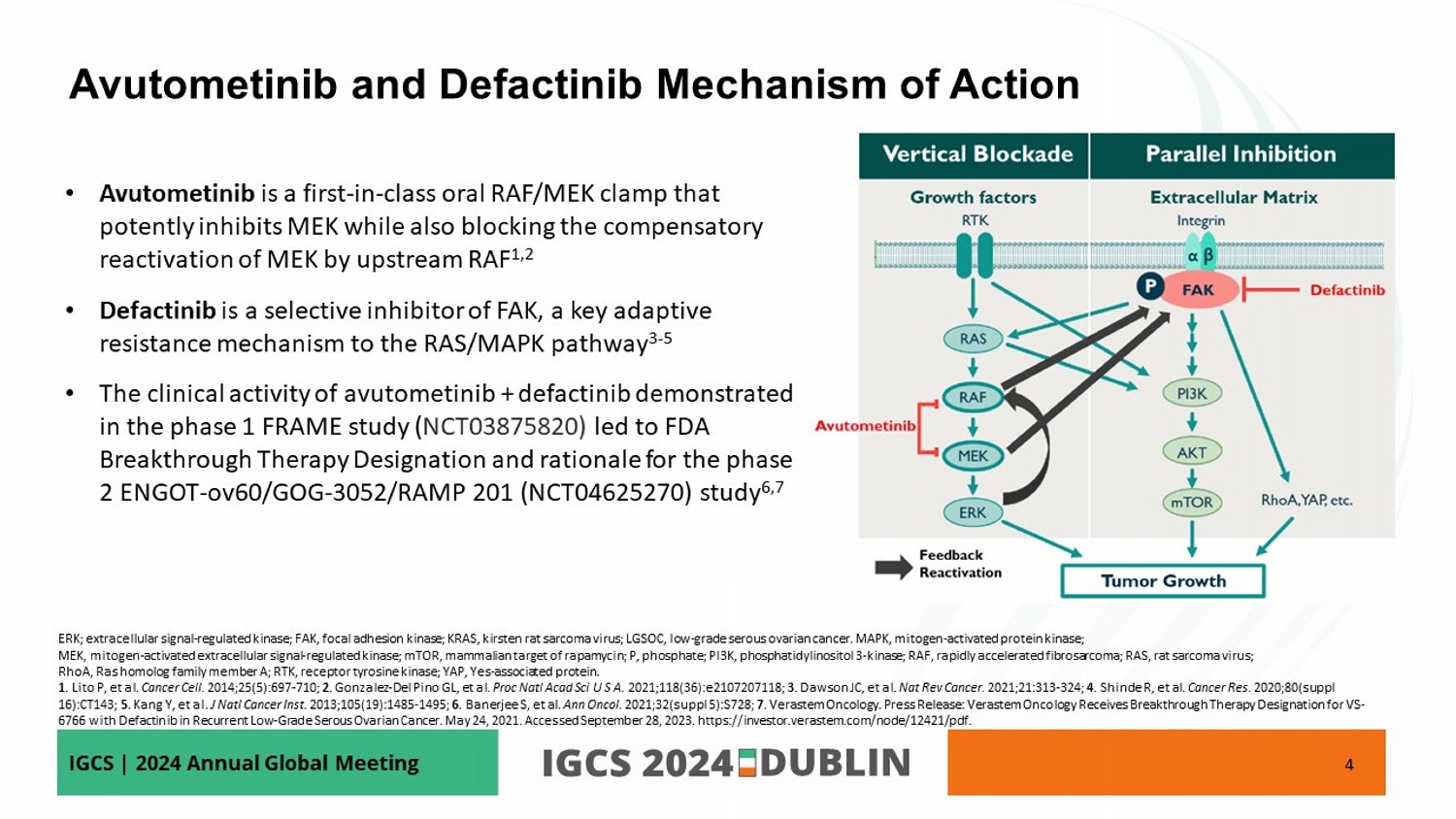IGCS | 2024 Annual Global Meeting • Avutometinib is a first - in - class oral RAF/MEK clamp that potently inhibits MEK while also blocking the compensatory reactivation of MEK by upstream RAF 1,2 • Defactinib is a selective inhibitor of FAK, a key adaptive resistance mechanism to the RAS/MAPK pathway 3 - 5 • The clinical activity of avutometinib + defactinib demonstrated in the phase 1 FRAME study ( NCT03875820) led to FDA Breakthrough Therapy Designation and rationale for the phase 2 ENGOT - ov60/GOG - 3052/RAMP 201 (NCT04625270) study 6,7 4 Avutometinib and Defactinib Mechanism of Action ERK; extracellular signal - regulated kinase; FAK, focal adhesion kinase; KRAS, kirsten rat sarcoma virus; LGSOC, low - grade serous ovarian cancer . MAPK, mitogen - activated protein kinase ; MEK, mitogen - activated extracellular signal - regulated kinase; mTOR, mammalian target of rapamycin; P, phosphate; PI3K, phosphati dylinositol 3 - kinase; RAF, rapidly accelerated fibrosarcoma; RAS, rat sarcoma virus; RhoA , Ras homolog family member A; RTK, receptor tyrosine kinase; YAP, Yes - associated protein. 1 . Lito P, et al. Cancer Cell. 2014;25(5):697 - 710; 2 . Gonzalez - Del Pino GL, et al. Proc Natl Acad Sci U S A . 2021;118(36):e2107207118; 3 . Dawson JC, et al. Nat Rev Cancer. 2021;21:313 - 324; 4 . Shinde R, et al. Cancer Res. 2020;80(suppl 16):CT143; 5 . Kang Y, et al. J Natl Cancer Inst. 2013;105(19):1485 - 1495; 6 . Banerjee S, et al. Ann Oncol. 2021;32( suppl 5):S728 ; 7 . Verastem Oncology. Press Release: Verastem Oncology Receives Breakthrough Therapy Designation for VS - 6766 with Defactinib in Recurrent Low - Grade Serous Ovarian Cancer. May 24, 2021. Accessed September 28, 2023. https://investor.v erastem.com/node/12421/pdf.