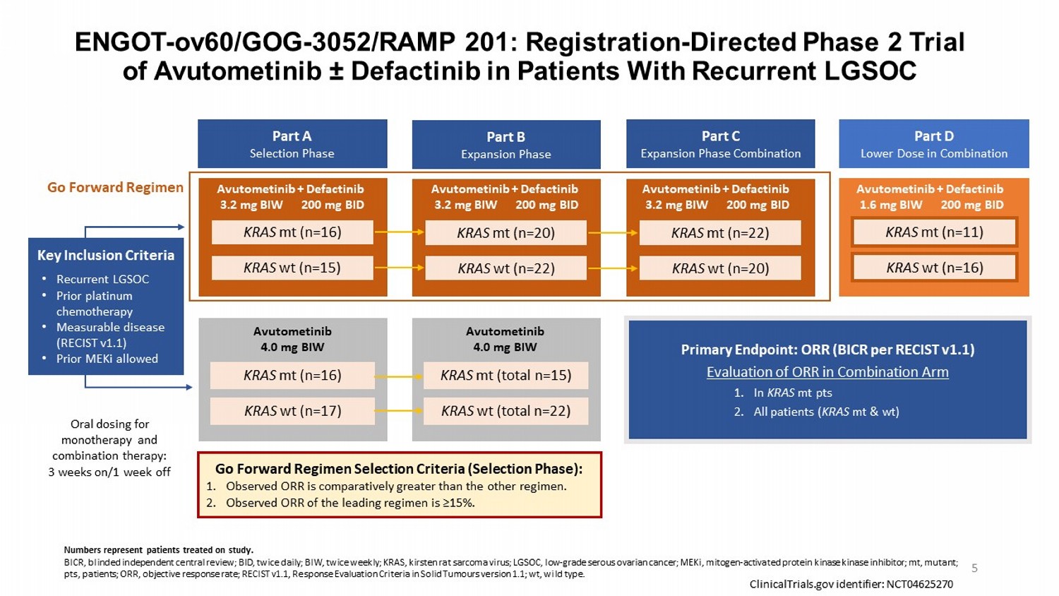 RAMP 201 (ENGOTov60/GOG3052) is an adaptive, two-part multicenter, parallel cohort, randomized, open-label trial to evaluate the efficacy and safety of avutometinib alone and in combination with defactinib in patients with recurrent low-grade serous ovarian cancer. The first part of the study (Part A) determined the selection of the go forward regimen, which was the combination of avutometinib and defactinib versus avutometinib alone, based on overall response rates. The expansion phases of the trial (Parts B and C) are evaluating the safety and efficacy of the go forward regimen of avutometinib 3.2 mg twice weekly and defactinib 200 mg twice daily. The Part D portion of the trial is evaluating a low dose of avutometinib in combination with defactinib to inform individualized dose reduction.