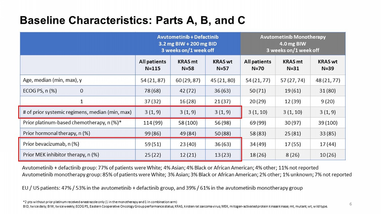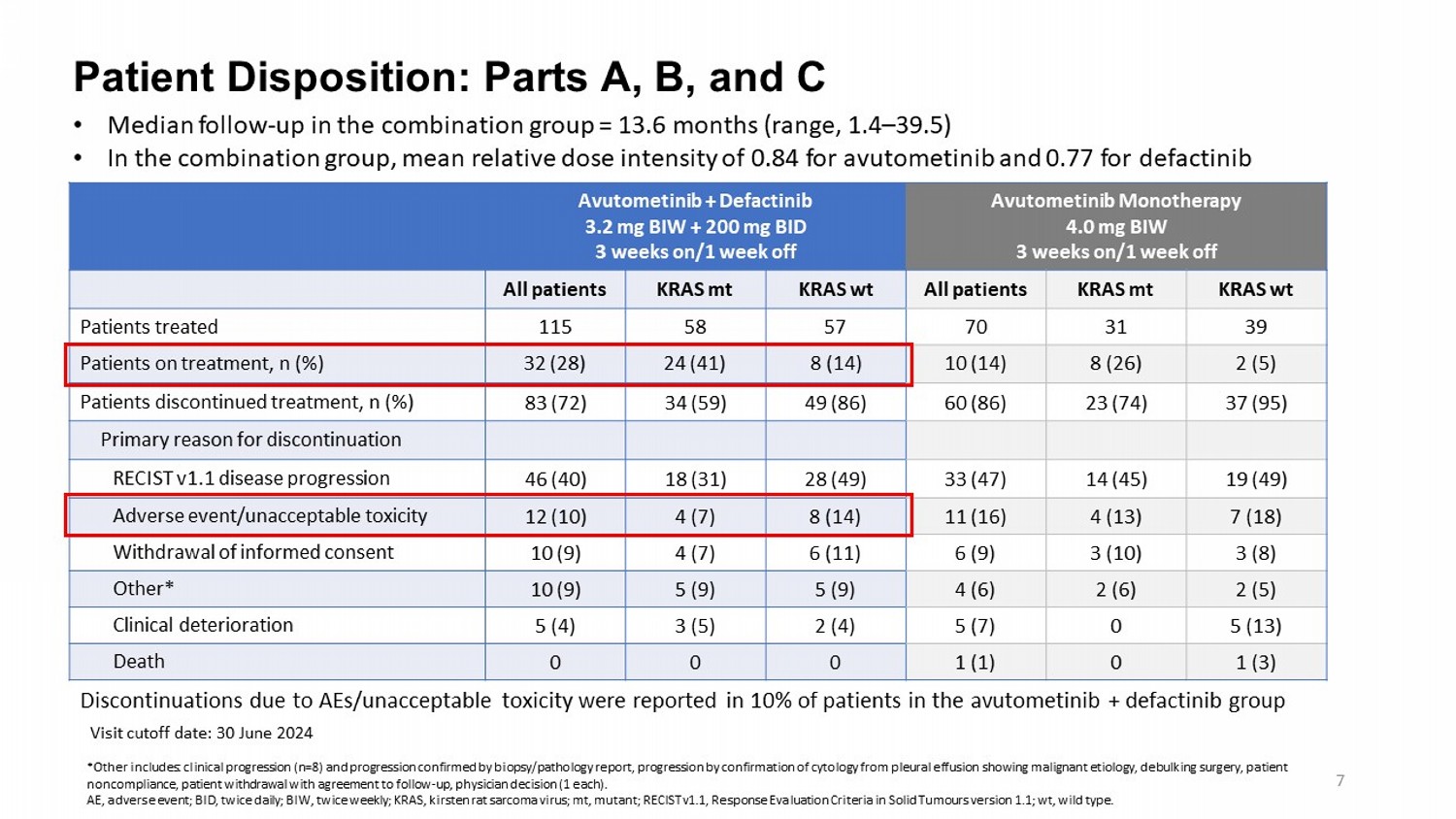 Baseline Characteristics: Parts A, B, and C Avutometinib Monotherapy 4.0 mg BIW 3 weeks on/1 week off Avutometinib + Defactinib 3.2 mg BIW + 200 mg BID 3 weeks on/1 week off KRAS wt N=39 KRAS mt N=31 All patients N=70 KRAS wt N=57 KRAS mt N=58 All patients N=115 48 (21, 77) 57 (27, 74) 54 (21, 77) 45 (21, 80) 60 (29, 87) 54 (21, 87) Age, median (min, max), y 31 (80) 19 (61) 50 (71) 36 (63) 42 (72) 78 (68) ECOG PS, n (%) 0 9 (20) 12 (39) 20 (29) 21 (37) 16 (28) 37 (32) 1 3 (1, 9) 3 (1, 10) 3 (1, 10) 3 (1, 9) 3 (1, 9) 3 (1, 9) # of prior systemic regimens, median (min, max) 39 (100) 30 (97) 69 (99) 56 (98) 58 (100) 114 (99) Prior platinum - based chemotherapy, n (%)* 33 (85) 25 (81) 58 (83) 50 (88) 49 (84) 99 (86) Prior hormonal therapy, n (%) 17 (44) 17 (55) 34 (49) 36 (63) 23 (40) 59 (51) Prior bevacizumab, n (%) 10 (26) 8 (26) 18 (26) 13 (23) 12 (21) 25 (22) Prior MEK inhibitor therapy, n (%) Avutometinib + defactinib group: 77% of patients were White; 4% Asian ; 4% Black or African American; 4% other; 11% not reported Avutometinib monotherapy group: 85 % of patients were White; 3% Asian ; 3% Black or African American; 2% other; 1% unknown; 7% not reported EU / US patients: 47% / 53% in the avutometinib + defactinib group, and 39% / 61% in the avutometinib monotherapy group *2 pts without prior platinum received anastrazole only (1 in the monotherapy and 1 in combination arm) BID, twice daily; BIW, twice weekly; ECOG PS, Eastern Cooperative Oncology Group performance status; KRAS, kirsten rat sarcoma virus; MEK, mitogen - activated protein kinase kinase ; mt, mutant; wt , wild type. 6