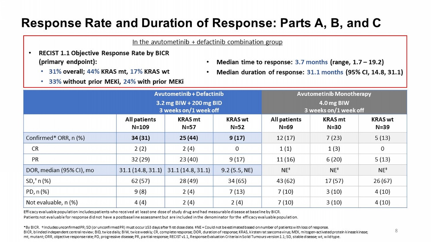 Patient Disposition: Parts A, B, and C Visit cutoff date: 30 June 2024 Avutometinib Monotherapy 4.0 mg BIW 3 weeks on/1 week off Avutometinib + Defactinib 3.2 mg BIW + 200 mg BID 3 weeks on/1 week off KRAS wt KRAS mt All patients KRAS wt KRAS mt All patients 39 31 70 57 58 115 Patients treated 2 (5) 8 (26) 10 (14) 8 (14) 24 (41) 32 (28) Patients on treatment, n (%) 37 (95) 23 (74) 60 (86) 49 (86) 34 (59) 83 (72) Patients discontinued treatment, n (%) Primary reason for discontinuation 19 (49) 14 (45) 33 (47) 28 (49) 18 (31) 46 (40) RECIST v1.1 disease progression 7 (18) 4 (13) 11 (16) 8 (14) 4 (7) 12 (10) Adverse event/unacceptable toxicity 3 (8) 3 (10) 6 (9) 6 (11) 4 (7) 10 (9) Withdrawal of informed consent 2 (5) 2 (6) 4 (6) 5 (9) 5 (9) 10 (9) Other* 5 (13) 0 5 (7) 2 (4) 3 (5) 5 (4) Clinical deterioration 1 (3) 0 1 (1) 0 0 0 Death Discontinuations due to AEs/unacceptable toxicity were reported in 10% of patients in the avutometinib + defactinib group • Median follow - up in the combination group = 13.6 months (range, 1.4 – 39.5) • In the combination group, mean relative dose intensity of 0.84 for avutometinib and 0.77 for defactinib 7 *Other includes: clinical progression (n=8) and progression confirmed by biopsy/pathology report, progression by confirmation of cytology from pleural effusion showing malignant etiology, debulking surgery, patient noncompliance, patient withdrawal with agreement to follow - up, physician decision (1 each). AE, adverse event; BID, twice daily; BIW, twice weekly ; KRAS, kirsten rat sarcoma virus; mt, mutant; RECIST v1.1, Response Evaluation Criteria in Solid Tumours version 1.1; wt , wild type .