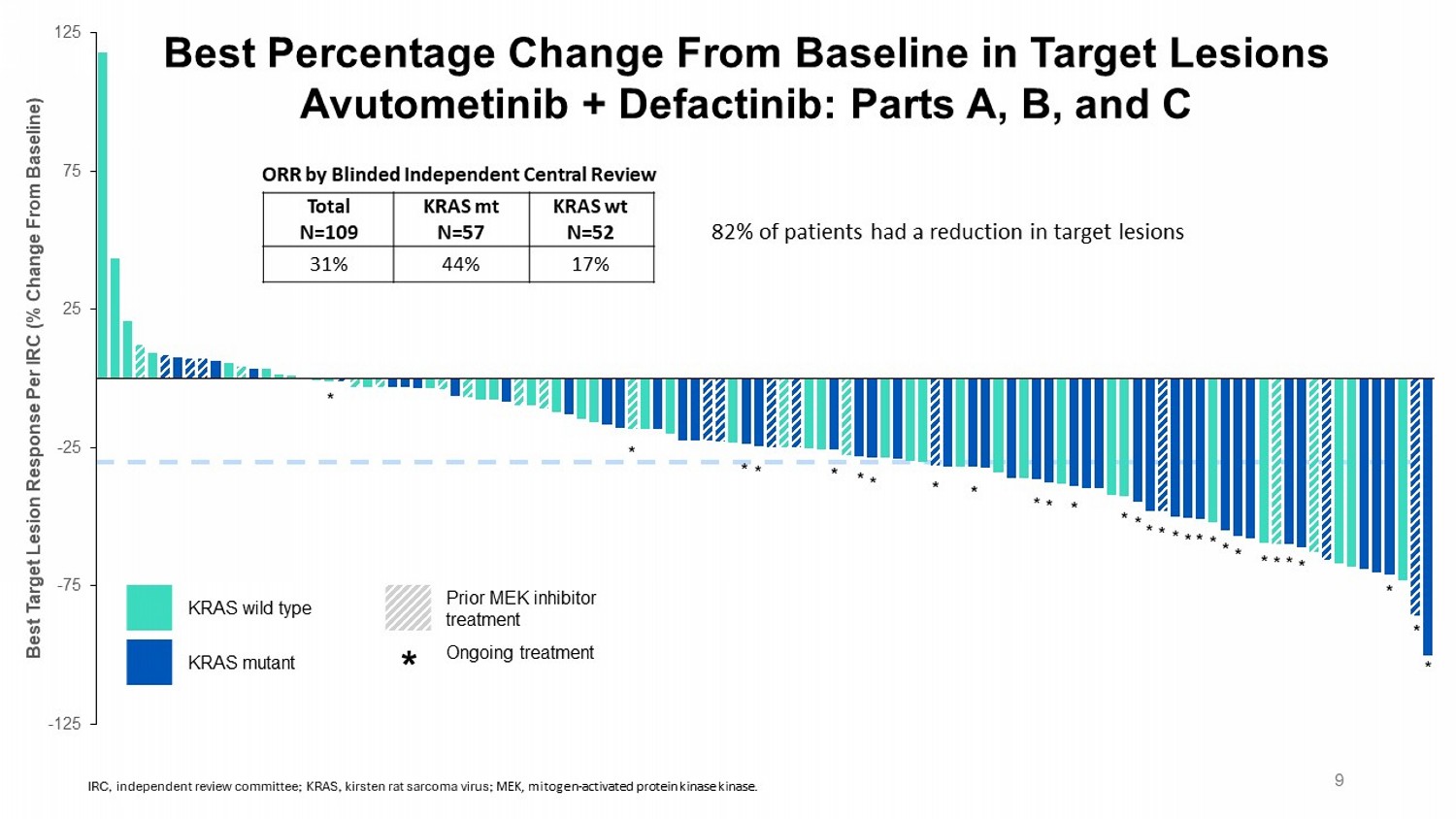 Response Rate and Duration of Response: Parts A, B, and C Avutometinib Monotherapy 4.0 mg BIW 3 weeks on/1 week off Avutometinib + Defactinib 3.2 mg BIW + 200 mg BID 3 weeks on/1 week off KRAS wt N=39 KRAS mt N=30 All patients N=69 KRAS wt N=52 KRAS mt N=57 All patients N=109 5 (13) 7 (23) 12 (17) 9 (17) 25 (44) 34 (31) Confirmed* ORR, n (%) 0 1 (3) 1 (1) 0 2 (4) 2 (2) CR 5 (13) 6 (20) 11 (16) 9 (17) 23 (40) 32 (29) PR NE ‡ NE ‡ NE ‡ 9.2 (5.5, NE) 31.1 (14.8, 31.1) 31.1 (14.8, 31.1) DOR, median (95% CI), mo 26 (67) 17 (57) 43 (62) 34 (65) 28 (49) 62 (57) SD, † n (%) 4 (10) 3 (10) 7 (10) 7 (13) 2 (4) 9 (8) PD, n (%) 4 (10) 3 (10) 7 (10) 2 (4) 2 (4) 4 (4) Not evaluable, n (%) Efficacy evaluable population includes patients who received at least one dose of study drug and had measurable disease at ba sel ine by BICR. Patients not evaluable for response did not have a postbaseline assessment but are included in the denominator for the effica cy evaluable population. *By BICR. †Includes unconfirmed PR; SD (or unconfirmed PR) must occur ≥53 days after first dose date. ‡ NE = Could not be estimated based on number of patients with loss of response. BICR, blinded independent central review; BID, twice daily; BIW, twice weekly; CR, complete response; DOR, duration of respon se; KRAS, kirsten rat sarcoma virus; MEK, mitogen - activated protein kinase kinase ; mt, mutant; ORR, objective response rate; PD, progressive disease; PR, partial response; RECIST v1.1, Response Evaluation Cri ter ia in Solid Tumours version 1.1; SD, stable disease; wt , wild type. 8 • RECIST 1.1 Objective Response Rate by BICR (primary endpoint): • 31% overall; 44% KRAS mt, 17% KRAS wt • 33% without prior MEKi , 24% with prior MEKi • Median time to response: 3.7 months (range, 1.7 – 19.2) • Median duration of response: 31.1 months (95% CI, 14.8, 31.1) In the avutometinib + defactinib combination group