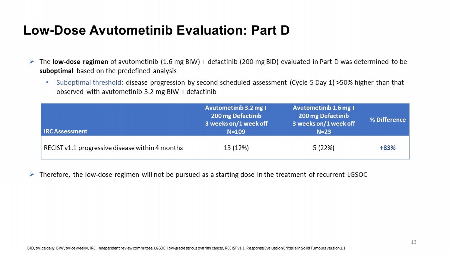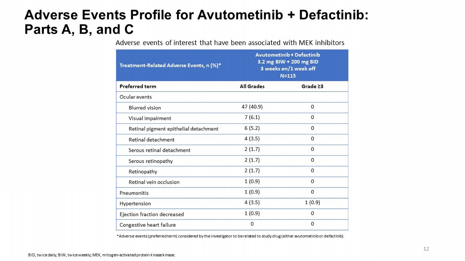 Adverse Events Profile for Avutometinib + Defactinib : Parts A, B, and C Avutometinib + Defactinib 3.2 mg BIW + 200 mg BID 3 weeks on/1 week off N=115 Treatment - Related Adverse Events, n (%)* Grade ≥3 All Grades Preferred term Ocular events 0 47 (40.9) Blurred vision 0 7 (6.1) Visual impairment 0 6 (5.2) Retinal pigment epithelial detachment 0 4 (3.5) Retinal detachment 0 2 (1.7) Serous retinal detachment 0 2 (1.7) Serous retinopathy 0 2 (1.7) Retinopathy 0 1 (0.9) Retinal vein occlusion 0 1 (0.9) Pneumonitis 1 (0.9) 4 (3.5) Hypertension 0 1 (0.9) Ejection fraction decreased 0 0 Congestive heart failure Adverse events of interest that have been associated with MEK inhibitors *Adverse events (preferred term) considered by the investigator to be related to study drug (either avutometinib or defactinib ). 12 BID, twice daily; BIW, twice weekly; MEK, mitogen - activated protein kinase kinase .