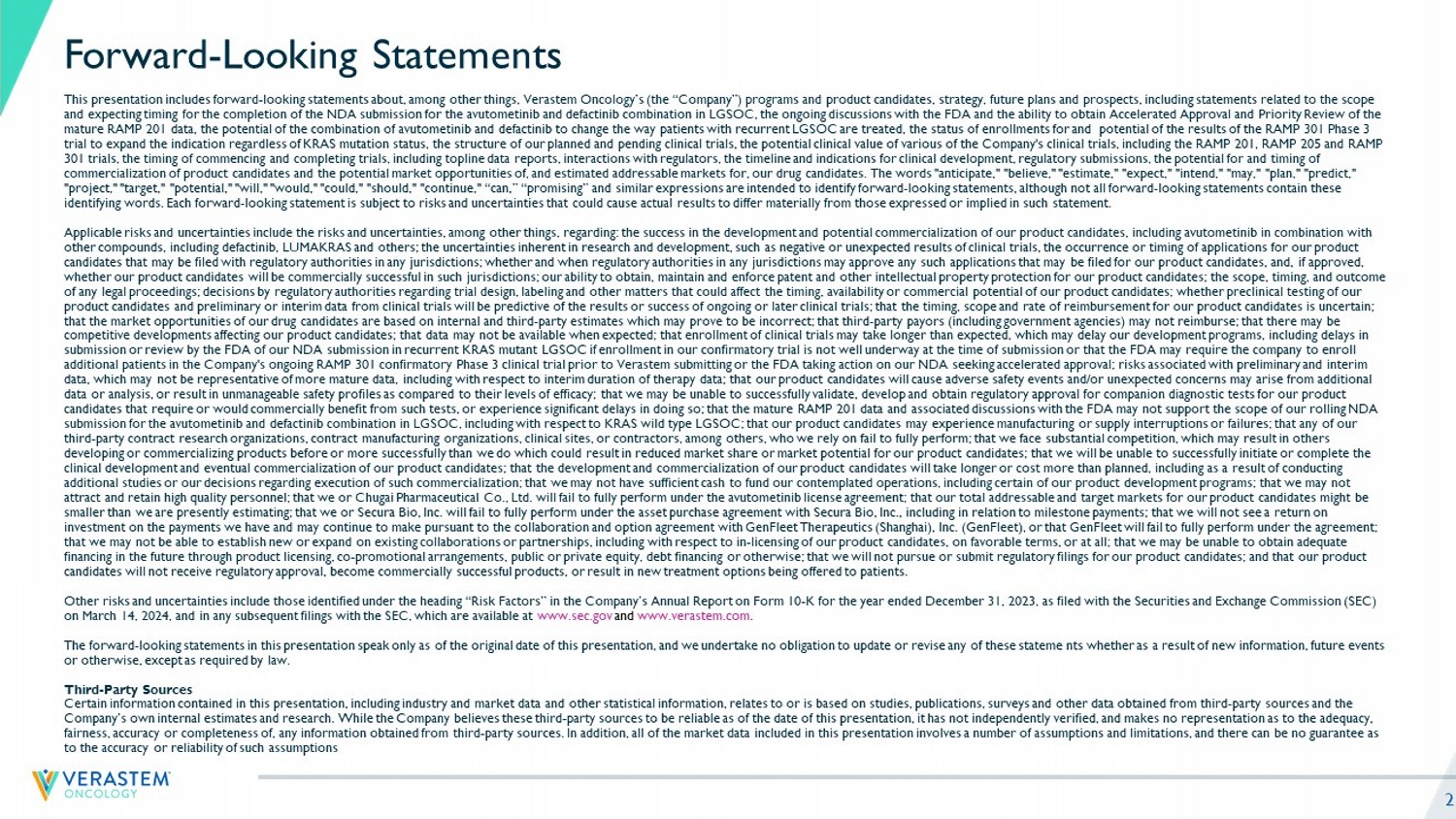 Forward-looking statements are not guarantees of future performance and are subject to risks and uncertainties that could cause our actual results to differ materially from those expressed or implied in the forward-looking statements we make. Applicable risks and uncertainties include the risks and uncertainties, among other things, regarding: the success in the development and potential commercialization of our product candidates, including avutometinib in combination with other compounds, including defactinib, LUMAKRAS™ and others; the uncertainties inherent in research and development, such as negative or unexpected results of clinical trials, the occurrence or timing of applications for our product candidates that may be filed with regulatory authorities in any jurisdictions; whether and when regulatory authorities in any jurisdictions may approve any such applications that may be filed for our product candidates, and, if approved, whether our product candidates will be commercially successful in such jurisdictions; our ability to obtain, maintain and enforce patent and other intellectual property protection for our product candidates; the scope, timing, and outcome of any legal proceedings; decisions by regulatory authorities regarding trial design, labeling and other matters that could affect the timing, availability or commercial potential of our product candidates; whether preclinical testing of our product candidates and preliminary or interim data from clinical trials will be predictive of the results or success of ongoing or later clinical trials; that the timing, scope and rate of reimbursement for our product candidates is uncertain; that the market opportunities of our drug candidates are based on internal and third-party estimates which may prove to be incorrect; that third-party payors (including government agencies) may not reimburse; that there may be competitive developments affecting our product candidates; that data may not be available when expected; that enrollment of clinical trials may take longer than expected, which may delay our development programs, including delays in submission or review by the FDA of our NDA submission in recurrent KRAS mutant LGSOC if enrollment in our confirmatory trial is not well underway at the time of submission, or that the FDA may require the Company to enroll additional patients in the Company’s ongoing RAMP-301 confirmatory Phase 3 clinical trial prior to Verastem submitting or the FDA taking action on our NDA seeking accelerated approval; risks associated with preliminary and interim data, which may not be representative of more mature data, including with respect to interim duration of therapy data; that our product candidates will cause adverse safety events and/or unexpected concerns may arise from additional data or analysis, or result in unmanageable safety profiles as compared to their levels of efficacy; that we may be unable to successfully validate, develop and obtain regulatory approval for companion diagnostic tests for our product candidates that require or would commercially benefit from such tests, or experience significant delays in doing so; that the mature RAMP 201 data and associated discussions with the FDA may not support the scope of our rolling NDA submission for the avutometinib and defactinib combination in LGSOC, including with respect to KRAS wild type LGSOC; that our product candidates may experience manufacturing or supply interruptions or failures; that any of our third party contract research organizations, contract manufacturing organizations, clinical sites, or contractors, among others, who we rely on fail to fully perform; that we face substantial competition, which may result in others developing or commercializing products before or more successfully than we do which could result in reduced market share or market potential for our product candidates; that we will be unable to successfully initiate or complete the clinical development and eventual commercialization of our product candidates; that the development and commercialization of our product candidates will take longer or cost more than planned, including as a result of conducting additional studies or our decisions regarding execution of such commercialization; that we may not have sufficient cash to fund our contemplated operations, including certain of our product development programs; that we may not attract and retain high quality personnel; that we or Chugai Pharmaceutical Co., Ltd. will fail to fully perform under the avutometinib license agreement; that the total addressable and target markets for our product candidates might be smaller than we are presently estimating; that we or Secura Bio, Inc. (Secura) will fail to fully perform under the asset purchase agreement with Secura, including in relation to milestone payments; that we will not see a return on investment on the payments we have and may continue to make pursuant to the collaboration and option agreement with GenFleet Therapeutics (Shanghai), Inc. (GenFleet), or that GenFleet will fail to fully perform under the agreement; that we may not be able to establish new or expand on existing collaborations or partnerships, including with respect to in-licensing of our product candidates, on favorable terms, or at all; that we may be unable to obtain adequate financing in the future through product licensing, co-promotional arrangements, public or private equity, debt financing or otherwise; that we will not pursue or submit regulatory filings for our product candidates; and that our product candidates will not receive regulatory approval, become commercially successful products, or result in new treatment options being offered to patients.