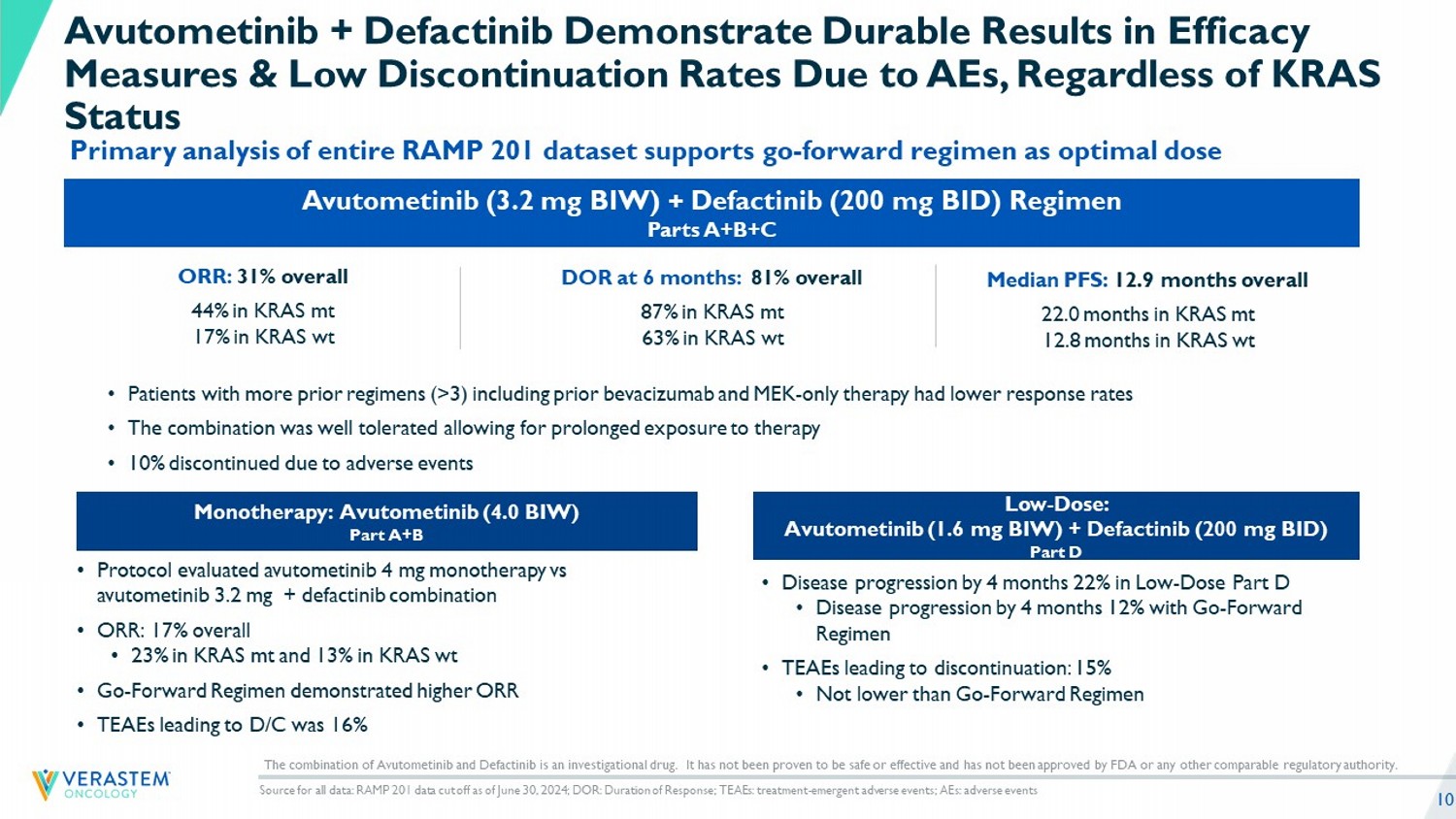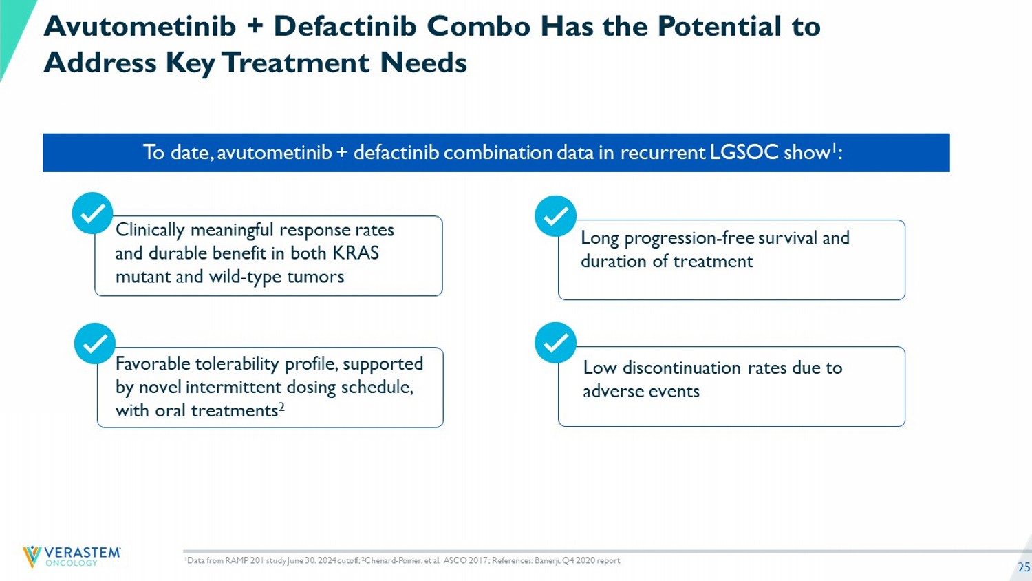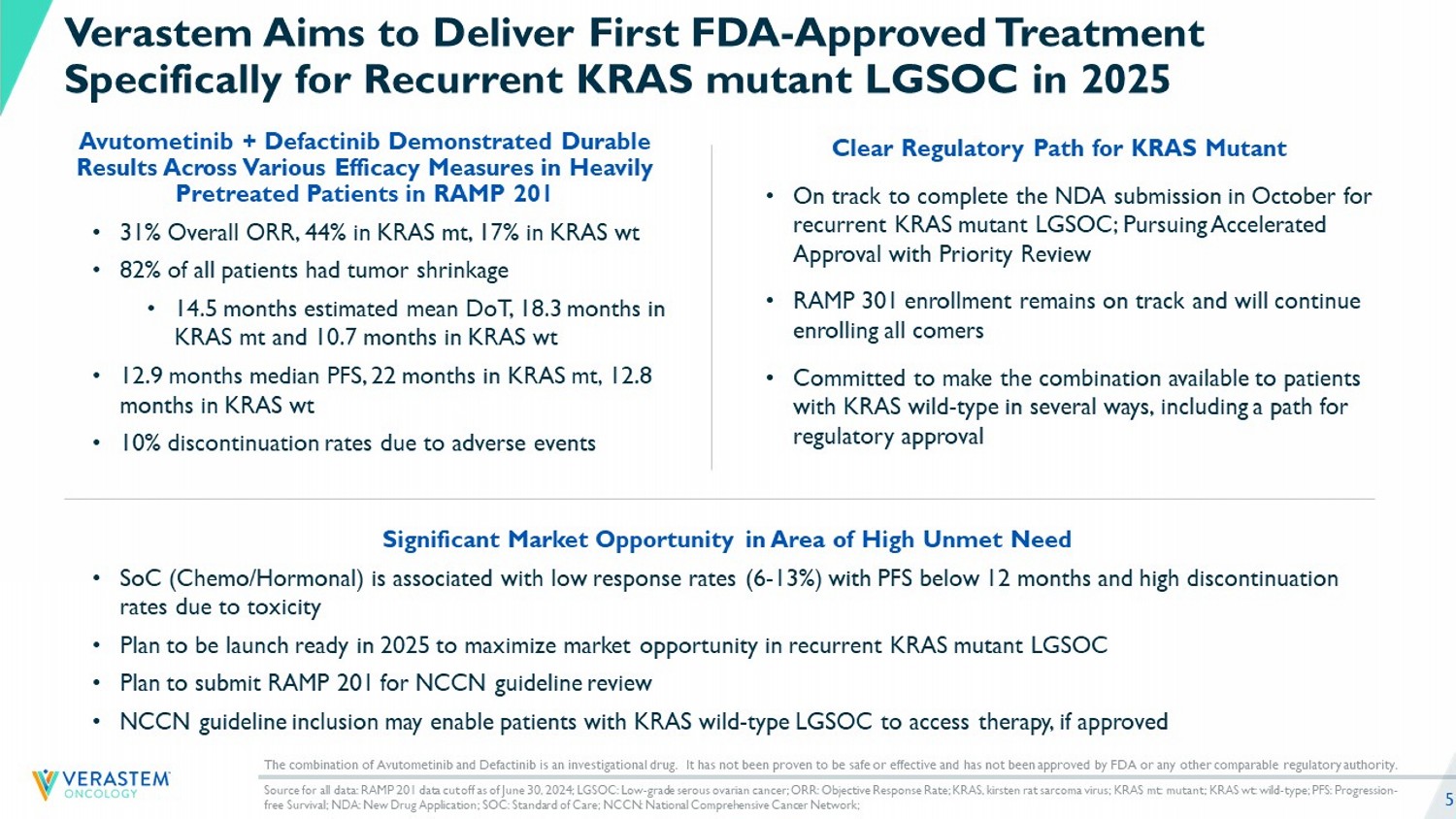 “In the mature data from the RAMP 201 trial most patients achieved tumor reductions and a median progression-free survival that was greater than one year across both KRAS mutant and KRAS wild-type patient populations. These results reinforce our confidence in the potential of the combination of avutometinib and defactinib to change how patients with recurrent low-grade serous ovarian cancer are treated,” said John Hayslip, M.D., chief medical officer of Verastem Oncology. “Encouraged by the durable clinical benefit seen in KRAS wild-type patients in RAMP 201 and the poorer prognosis in this subset of patients that are treated with sub-optimal treatment choices today, we believe that this treatment combination will be the preferred treatment option for all subgroups of patients with recurrent low-grade serous ovarian cancer. We are committed to making the combination available to these patients, including working with the FDA to outline a path forward to expand the indication with additional data.”