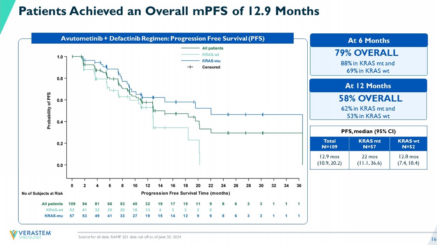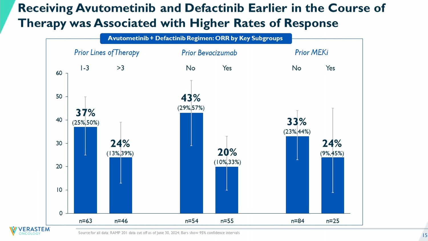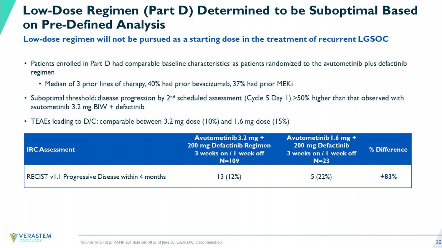 “In the mature data from the RAMP 201 trial most patients achieved tumor reductions and a median progression-free survival that was greater than one year across both KRAS mutant and KRAS wild-type patient populations. These results reinforce our confidence in the potential of the combination of avutometinib and defactinib to change how patients with recurrent low-grade serous ovarian cancer are treated,” said John Hayslip, M.D., chief medical officer of Verastem Oncology. “Encouraged by the durable clinical benefit seen in KRAS wild-type patients in RAMP 201 and the poorer prognosis in this subset of patients that are treated with sub-optimal treatment choices today, we believe that this treatment combination will be the preferred treatment option for all subgroups of patients with recurrent low-grade serous ovarian cancer. We are committed to making the combination available to these patients, including working with the FDA to outline a path forward to expand the indication with additional data.”