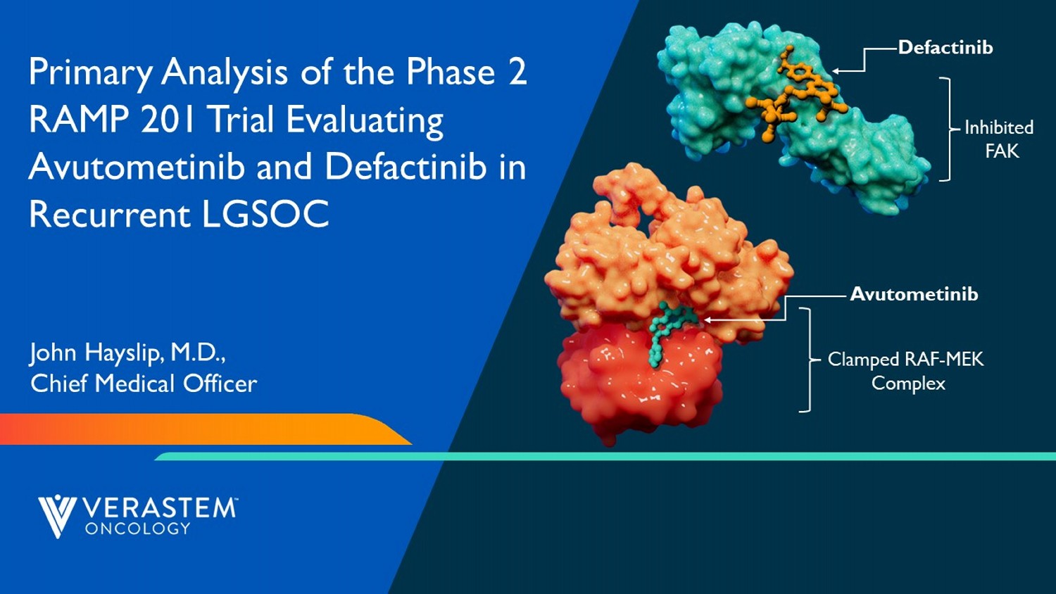 Verastem Oncology is currently conducting clinical trials with avutometinib in RAS/MAPK driven tumors as part of its Raf And Mek Program or RAMP. Verastem is currently enrolling patients and activating sites for RAMP 301 (NCT06072781) an international Phase 3 confirmatory trial evaluating the combination of avutometinib and defactinib, a selective FAK inhibitor, versus standard chemotherapy or hormonal therapy for the treatment of recurrent low-grade serous ovarian cancer (LGSOC). RAMP 201 (NCT04625270) is a Phase 2 registration-directed trial of avutometinib in combination with defactinib in patients with recurrent LGSOC and enrollment has been completed for the RAMP 201 trial.