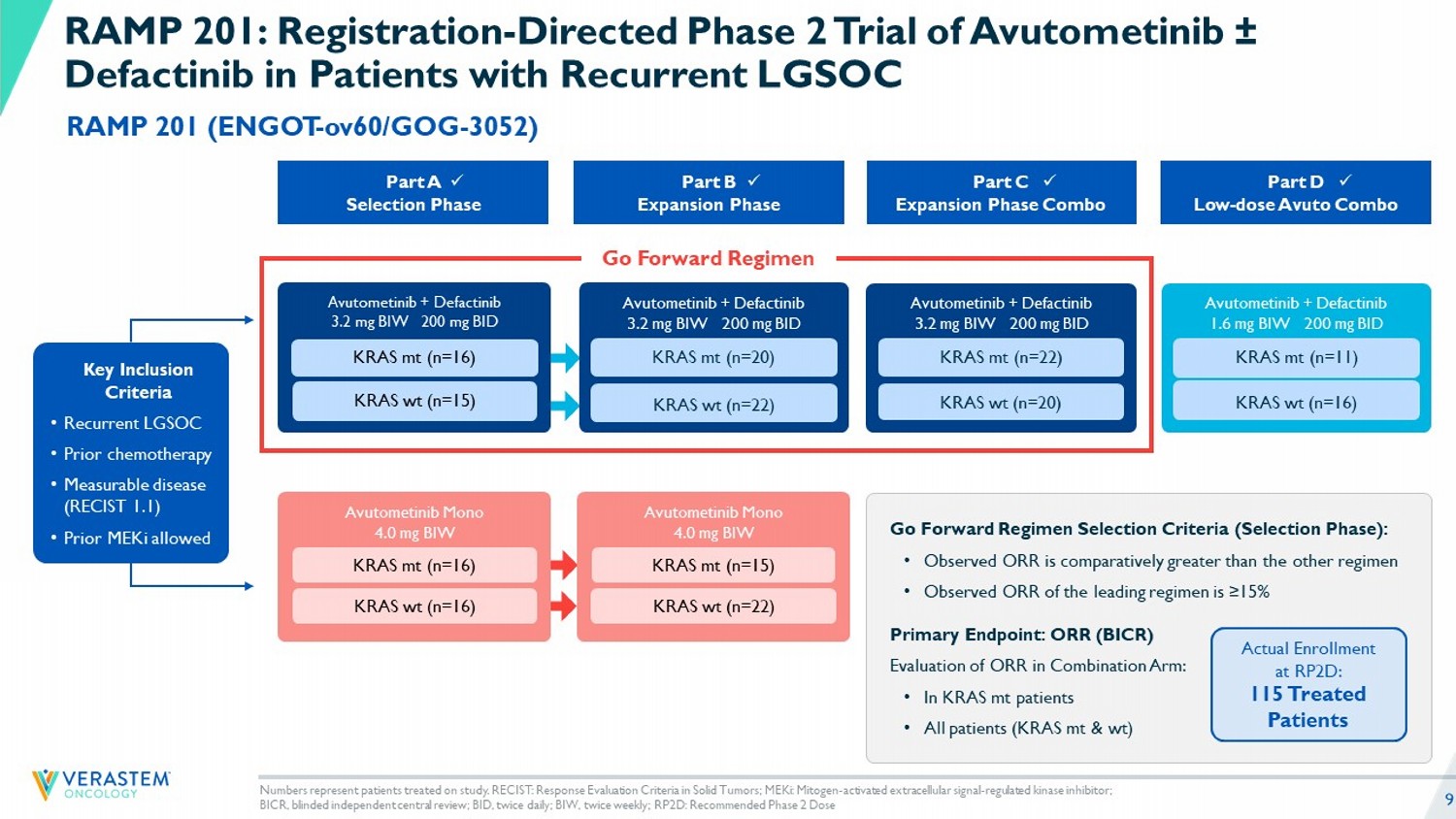 8 • 70% of LGSOC tumors are driven by RAS/MAPK pathway - associated mutations 1 - 4 • 30% are KRAS mutant with other mutations including NRAS, BRAF, NF1, and other RAS pathway - associated gene mutations • Avutometinib is an oral RAF/MEK clamp that potently inhibits MEK kinase activity while also blocking the compensatory reactivation of MEK by upstream RAF 5 - 7 • FAK is activated in response to MAPK pathway inhibition by avutometinib as well as by RAF inhibitors and MEK - only inhibitors 8, 9 • Defactinib is an oral selective FAK inhibitor that inhibits parallel pathway signaling and FAK inhibition has been demonstrated to enhance the antitumor efficacy of avutometinib both preclinically and clinicall 10 - 12 • Together, avutometinib and defactinib has the potential to offer more complete blockade of the signaling that drives the growth of RAS/MAPK pathway - dependent tumors with the objective of deeper and more durable responses Avutometinib + Defactinib Aims to Inhibit Multiple Resistance Mechanisms in the RAS/MAPK Pathway to Improve Patient Outcomes Inhibition of RAF/MEK activates FAK adaptive resistance ERK; extracellular signal - regulated kinase; FAK, focal adhesion kinase; MAPK, mitogen - activated protein kinase ; MEK, mitogen - activated extracellular signal - regulated kinase; mTOR, mammalian target of rapamycin; P, phosphate; PI3K, phosphatidylinositol 3 - kinase; RAF, rapidly ac celerated fibrosarcoma; RAS, rat sarcoma virus; RhoA , Ras homolog family member A; RTK, receptor tyrosine kinase; YAP, Yes - associated protein. 1 AACR Genie v16.1; 2 Cheasley et al., J Pathol 2021; 3 Thomson et al., Gynecol Oncol 2023; 4 Gershenson et al., Gynecol Oncol 2022; 5 Coma et al., AACR 2022 ; 6 Ishii et al., Cancer Res, 2013 ; 7 Lito et al., Cancer Cell, 2014 ; 8 Lubrano et al., AACR 2024 ; 9 Banerji et al., AACR 2020 ; 10 Jones et al., Invest New Drugs 2015; 11 McNamara et al., Gynecol Oncol 2024 ; 12 Banerjee et al., ASCO 2023