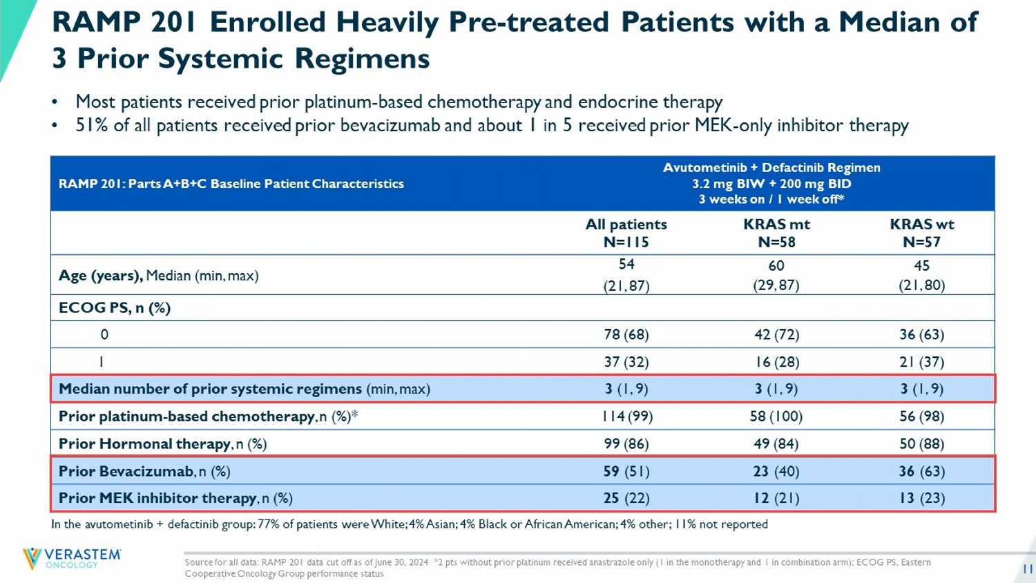 10 Avutometinib (3.2 mg BIW) + Defactinib (200 mg BID) Regimen Parts A+B+C ORR: 31% overall 44% in KRAS mt 17% in KRAS wt Low - Dose: Avutometinib (1.6 mg BIW) + Defactinib (200 mg BID) Part D • Disease progression by 4 months 22% in Low - Dose Part D • Disease progression by 4 months 12% with Go - Forward Regimen • TEAEs leading to discontinuation: 15% • Not lower than Go - Forward Regimen Monotherapy: Avutometinib (4.0 BIW) Part A+B • Protocol evaluated avutometinib 4 mg monotherapy vs avutometinib 3.2 mg + defactinib combination • ORR: 17% overall • 23% in KRAS mt and 13% in KRAS wt • Go - Forward Regimen demonstrated higher ORR • TEAEs leading to D/C was 16% Avutometinib + Defactinib Demonstrate Durable Results in Efficacy Measures & Low Discontinuation Rates Due to AEs, Regardless of KRAS Status Primary analysis of entire RAMP 201 dataset supports go - forward regimen as optimal dose Source for all data: RAMP 201 data cut off as of June 30, 2024; DOR: Duration of Response; TEAEs: treatment - emergent adverse eve nts; AEs: adverse events • Patients with more prior regimens (>3) including prior bevacizumab and MEK - only therapy had lower response rates • The combination was well tolerated allowing for prolonged exposure to therapy • 10% discontinued due to adverse events Median PFS: 12.9 months overall 22.0 months in KRAS mt 12.8 months in KRAS wt DOR a t 6 months: 81% overall 87% in KRAS mt 63% in KRAS wt The combination of Avutometinib and Defactinib is an investigational drug. It has not been proven to be safe or effective and h as not been approved by FDA or any other comparable regulatory authority.