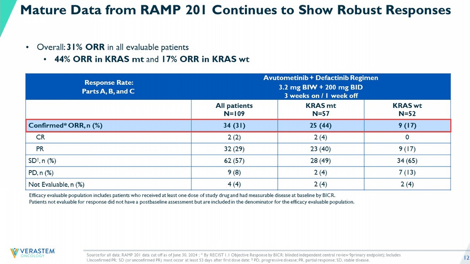 11 Avutometinib + Defactinib Regimen 3.2 mg BIW + 200 mg BID 3 weeks on / 1 week off* RAMP 201: Parts A+B+C Baseline Patient Characteristics KRAS wt N=57 KRAS mt N=58 All patients N=115 45 (21, 80) 60 (29, 87) 54 (21, 87) Age (years), Median (min, max) ECOG PS, n (%) 36 (63) 42 (72) 78 (68) 0 21 (37) 16 (28) 37 (32) 1 3 (1, 9) 3 (1, 9) 3 (1, 9) Median number of prior systemic regimens (min, max) 56 (98) 58 (100) 114 (99) Prior platinum - based chemotherapy , n (%)* 50 (88) 49 (84) 99 (86) Prior Hormonal therapy , n (%) 36 (63) 23 (40) 59 (51) Prior Bevacizumab , n (%) 13 (23) 12 (21) 25 (22) Prior MEK inhibitor therapy , n (%) RAMP 201 Enrolled Heavily Pre - treated Patients with a Median of 3 Prior Systemic Regimens • Most patients received prior platinum - based chemotherapy and endocrine therapy • 51% of all patients received prior bevacizumab and about 1 in 5 received prior MEK - only inhibitor therapy In th e avutometinib + defactinib group: 77% of patients were White; 4% Asian ; 4% Black or African American; 4% other; 11% not reported Source for all data: RAMP 201 data cut off as of June 30, 2024 *2 pts without prior platinum received anastrazole only (1 in the monotherapy and 1 in combination arm); ECOG PS, Eastern Cooperative Oncology Group performance status